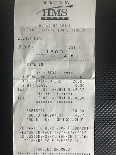 Read moreI was very disappointed with this location. I understand the need for keeping social distancing right now, but being cordial from a distance is doable. We arrived and were on a layover so needed to grab a bite. We were seated, left with a menu, and that was when it went down hill. 4 waitresses/waiters passed us by a few times with no acknowledgement, no "I'll be with you in a moment". Waited about 15 minutes and a waitress asked if we were going to order. My smart mouth almost stated "Nope. Just here to watch everyone else eat." Let her know we were waiting for someone to take are order and she then asked you didn't order on the app? What app and why? You handed me a menu when we sat down. She then said "You want me to take your order?" Whelp, I think that's part of the job isn't it? Finally order and get our food another 20 minutes later. It was the worst Chicken Marsala (and I've had it from another location of theirs before and it was awesome) ever. The chicken was dry, as thin as a piece of paper, the pasta and sauce was non existent. My friends dish of simple spaghetti and meatballs was worse then if you got it from a frozen food. The meatballs were dry and no flavor and the "meat sauce" was less flavorful then a jar of premade sauce from the store. We couldn't finish half of the meal. Paid, left and went down to grab McDonald's before having to hop on the plane! McDonald's! Could've saved my money and time elsewhere.