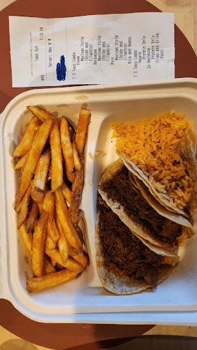 for the past year, every week, I would get the taco platter that comes with 3 tacos and your choice of 2 sides. I usually get rice and beans as sides which is fine and sometimes fries which the batter is pretty good. The veggie taco is good, as well as the al pastor. The “steak” taco could be good except they don’t use steak, they use carne picado (like larger pieces of ground beef), so it’s more tough. The barbacoa and chicken are tasteless and terrible texture, so I stick with my veggie, al pastor, and sometimes steak.