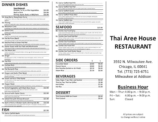 Read moreFinally, A New Updated Menu January 2021 Thai Aree House is one of my Absolute Favorite Thai Restaurants in Old Irving Park Neighborhood. It has been around for about 30+ years & still going strong! Eddie & Ann are an Amazing Team. No matter how busy the restaurant is the food still taste the same! The Quality & Quantity is why i come back. Everything just taste so Amazing. My personal favorites are the Mixed Satay (love there peanut sauce), Fresh Garlic Beef (love the fresh slices of garlic on top), Tom Kha Vegetable Soup (coconut broth is very light but flavorful & love that the vegetables are crunchy. Please be patient with this restaurant. They do get very busy but everything is made to order. HIghly Recommend...