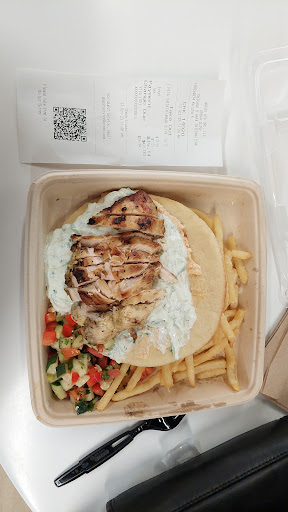 The food was pretty good and the cook was kind. Unfortunately the cashier was very rude, mumbled, and did not explain the toppings that came with the pita and what would cost extra. When I first approached the cashier said abruptly "our cook isn't here you will have to come back in 10 minutes." The cook appeared within seconds. The order was initially placed incorrectly (as a bowl) which I noticed before I was charged, and then when I corrected that I wanted a pita it was met with frustration. The menu on the wall is nonintuitive (you have to ask for olives, feta, toppings, etc) so I did not know to order them at the time of purchase or I would have. When the cook was handing me my food I asked for feta and they said "it doesn't come with feta," they closed the lid and handed it to me with what seemed to be an attitude hoping I would go away. I understand I am at an airport and have little hope for kindness from retail service even when I am being kind, but this was...