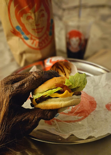 Ordered a Dave's Double meal through the drive-thru and several fries and JBC's for my little howling demons. Had to transfer my Dr Pepper to a shallow bowl to lap it up, as drinking liquid through a straw with a spooky dog mouth is quite difficult, but the Dr Pepper was crisp and refreshing. The fries were a bit stale, dry, and not even warm, but the burgers were at least good.