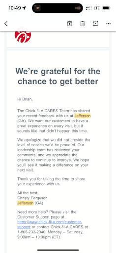 Read moreEveryone brushes off the problems at the Jefferson Chick-fil-A by saying "it's just kids" referring to the seemingly high school aged people working there, or "it's still new" after it's been open for months now. Well, the first few times I chalked my experiences up to this too.