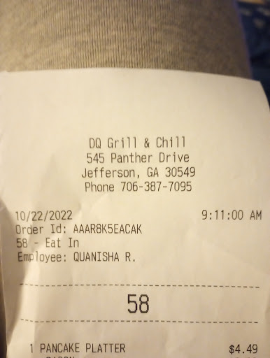 Read moreWe are from Gainesville and we stopped by this DQ on our way through Jackson County. We ordered two kid cups with sprinkles and we wanted a cone added on the side. We did not get the cones and we were charged for a kid DIPPED cone, which is $2.19.When we mentioned it to the cashier at the drive thru, she told us that a kid cup with sprinkles was three dollars. So we took the kid cups and left. I just called and spoke with the manager on duty. I asked her what the price was for the kid cups. They are $1.89. I told her we were from Hall County and we didnt get the cones with our order AND we were overcharged and the cashier tried telling us that it was more.She said she would give us .40 cent back. First of all, it is a total of $.60 that we were overcharged. Second of all, I am NOT driving to a different county for .40 cent! It is not about the money, but the lack of professionalism from more than one employee. I will not...