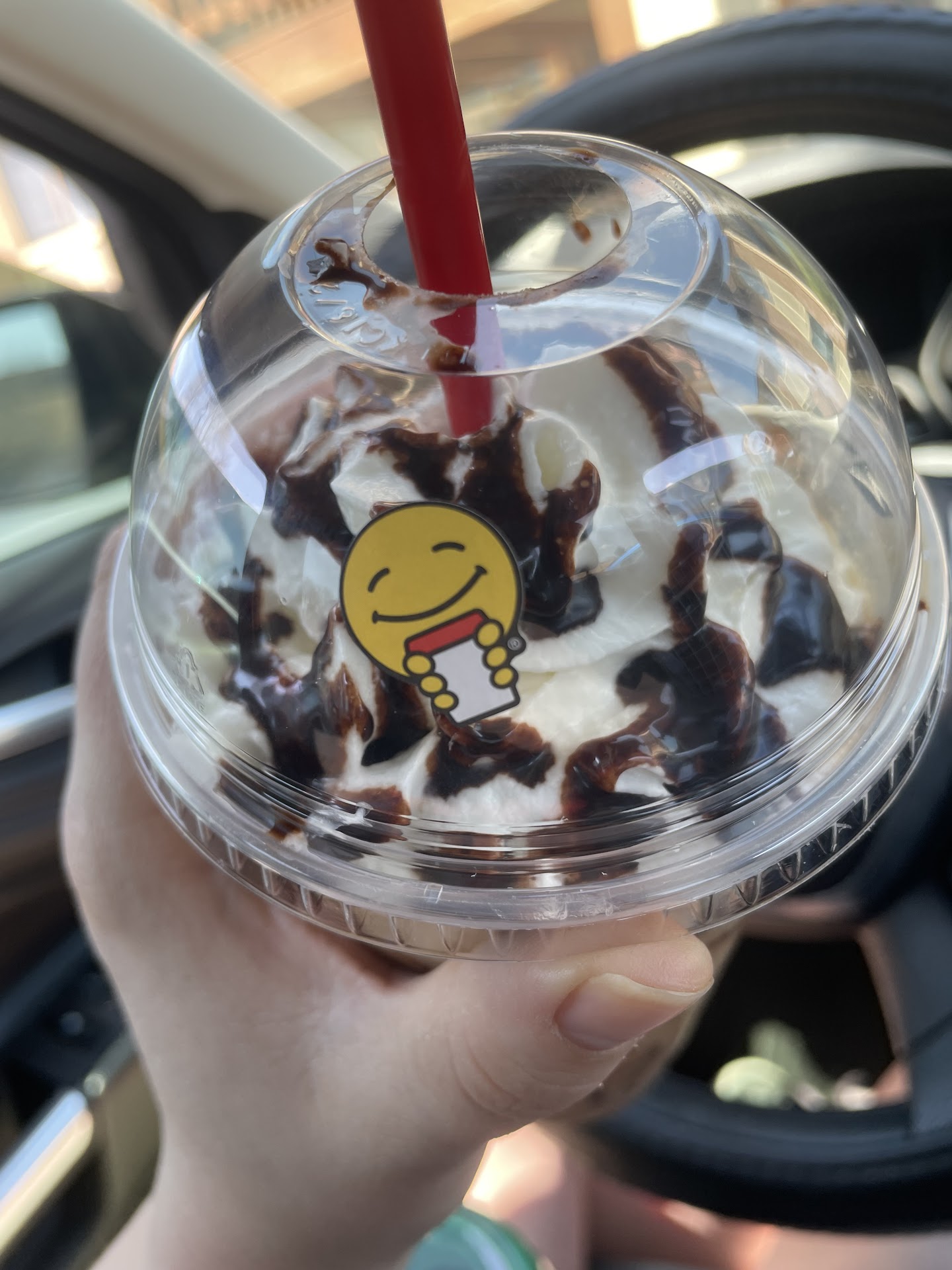 On one occasion I ordered a Large Caramelicious on a Friday. The Caramelicious is, according to their website, "Buttery smooth caramel sauce, frothy hot milk, and our world-class espresso combine for a fabulous flavor, and we top our signature drink with fluffy whipped cream drizzled with more caramel." The Caramelicious, when made correctly comes in a cup with a domed lid to accommodate the whip and the caramel drizzle. That is not what I got. Instead I got a Caramelicious MINUS the whip and caramel drizzle (photo attached).