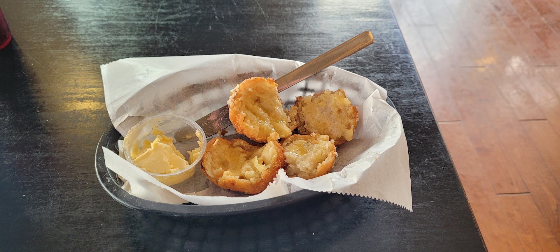 The food and service left a bit to be desired, however. Our server came to our table promptly after seating and gave us four complimentary hush puppies. They were hot but extremely bland and tasted like fried white bread with a plain coating. The pups lack of taste were a harbinger of things to come.