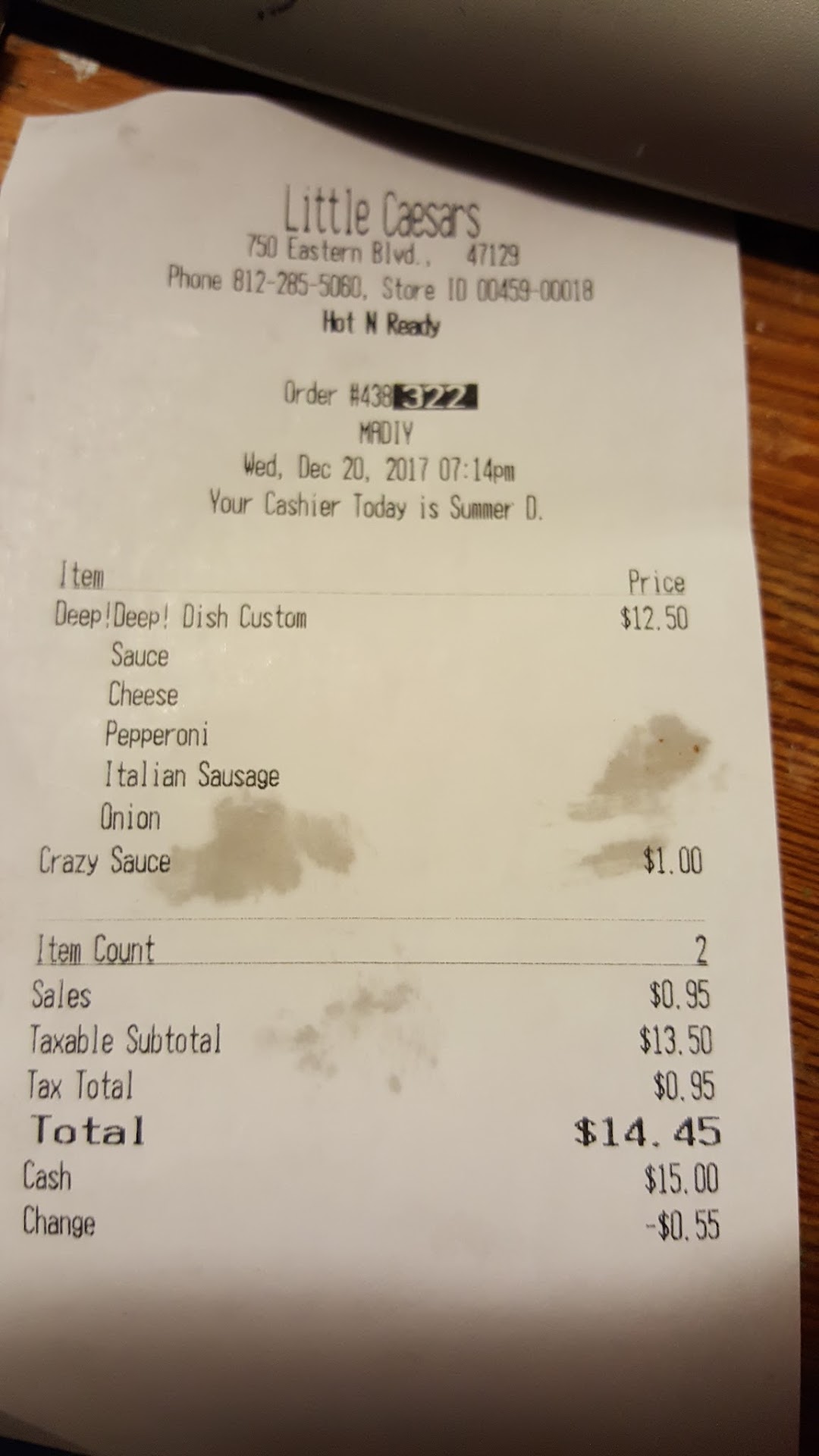 Read moreI walked in ordered a pepperoni pan pizza add italian sausage and onion the girl misunderstood what I said since when the order was ready she did not repeat pepperoni. I told her I wanted to add the other toppings in addition and it was a misunderstanding. She told the manager who told her to tell me that he would add the pepperoni to the already made pizza. I told her no and she got him to talk to me. I explained it was a misunderstanding I will pay for the extra topping since I had already paid cash for the pizza and have the pizza remade, not recook the same pizza and burn pizza to add the topping. He said he could not add to his waste count so I told him then I want my money refunded. He refunds the money. I asked his name he said it is John Smith. I told him now not only do you have a wasted pizza but you lost a sell with 3 toppings because you refuse to make it. I then called Clarksville Little Caesars, ordered it and picked up the pizza I wanted. I also was going to order breadsticks and sauce for the free soda if he would of done what he should of done over a honest mistake, so even more money lost. I just ordered ex sauce at the Clarksville location instead though once there since I drove out of my way and lost some appetite over the nonsense. Train your shift managers better this was truly ridiculous. I will not come there again. I will drive out of my way for...