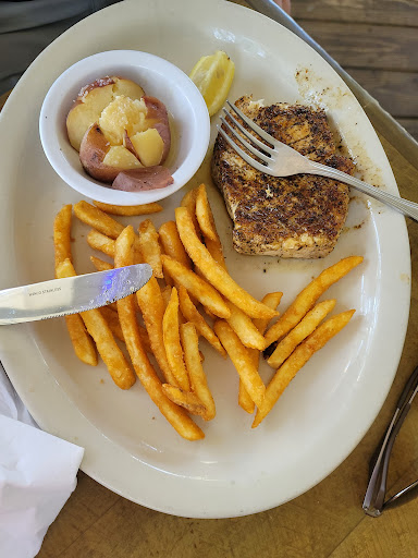 Read moreWe were here on a Sunday afternoon, and the front porch had a sign reading, "Holy $#& we made it 5 years!" Immediately, we felt conflicted because either we were in for a treat or we were eating at a place where the people don't have kids. (The 8-year-old: "Mommy, what's $#&‽" The 14-year-old takes a picture to text his friends.) We chose to eat outside, and the view from the table was wonderful. There's enough wind that there was no oceanfront smell, and while that might be something you expect around that type of area, it was nice having a meal without it. For appetizers, we had Crab Stew. It was good and creamy. (We tried to order oysters, but there's a supply problem right now which, while a bummer, isn't their fault.) The server was great. While she didn't know the menu well and wasn't the most personable, she did ask about allergy concerns and check in on us regularly to make sure we were good. For meals, we had: Child 1 - Kids fish plate. She loved it, and they have malt vinegar that makes her super happy. We tasted it, and it was nondescript white fish (maybe tilapia?). Child 2 - Swordfish steak with fries and red potatoes. He is adventurous but has a lot of food allergies, and the care taken for his dish was phenomenal. They genuinely cared to make sure there was no cross-contamination. Adult 1 - Shrimp Po Boy. This was the win of the table. The shrimp is cleaned, and to us, that's a big deal. Adult 2 - Greek Salad. Okay, so it's a salad, and I tend to expect a wilty piece or two. However, having a husband in the industry, we were surprised this salad would be served as it was. The cucumber had clearly been frozen, and it was visibly gooey, see-through green. The tomatoes had two brown rotten spots on them. Since they are served in wedges, it would have been easy to cut the icky parts out, but the person building the salad obviously didn't care. As expected, there was some brown-edged lettuce, but there was also wilty lettuce that looked like it, too, had been frozen. All in all, we would definitely go back and eat here again. The food, overall, was just okay, but we really think that was related to menu changes based on shortages and not a...