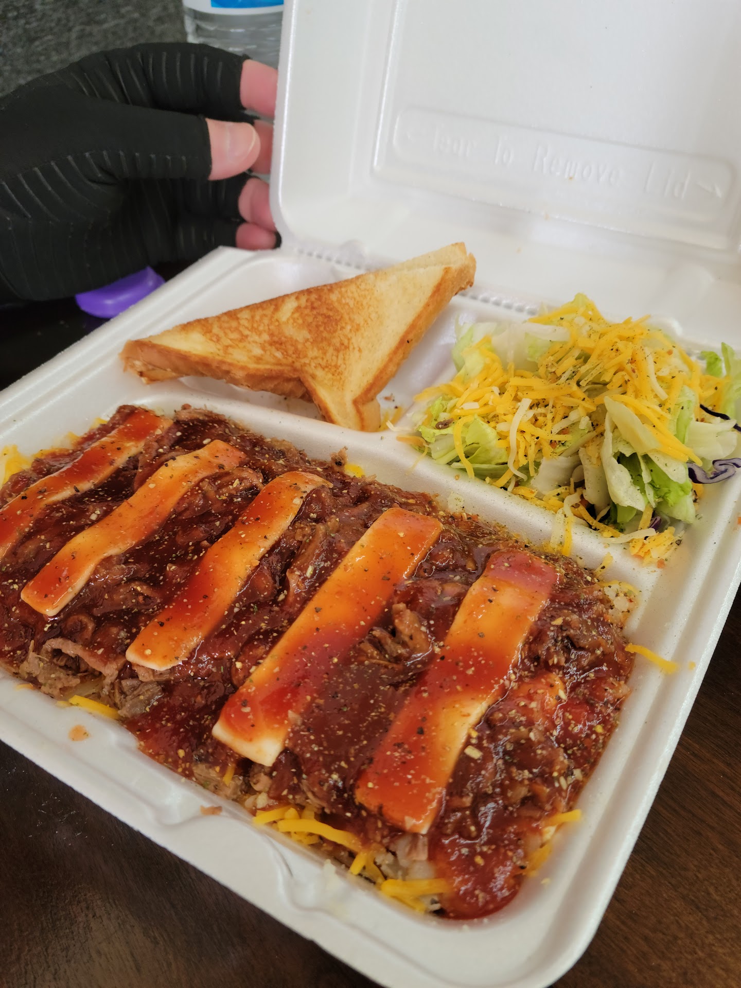 Read moreI saw pictures of the food here and couldn't tell what I was looking at so obviously I had to have it. First of all, the amount of food they give you is irresponsible. They must be using the world's largest potatoes or something because these boxes are FULL and HEAVY. We should have just shared one! Inside the box is potato mountain topper with tons of barbecue sauce, cheese, and ??? Who knows what else. I got hot links on mine and I'm not sure they added a ton to the experience, there was so much other stuff going on they sorta got lost. It's messy and saucy and and smoky and filling and so dang good. The salad and toast were also pretty great! The woman at the counter was funny and helpful and we had a...