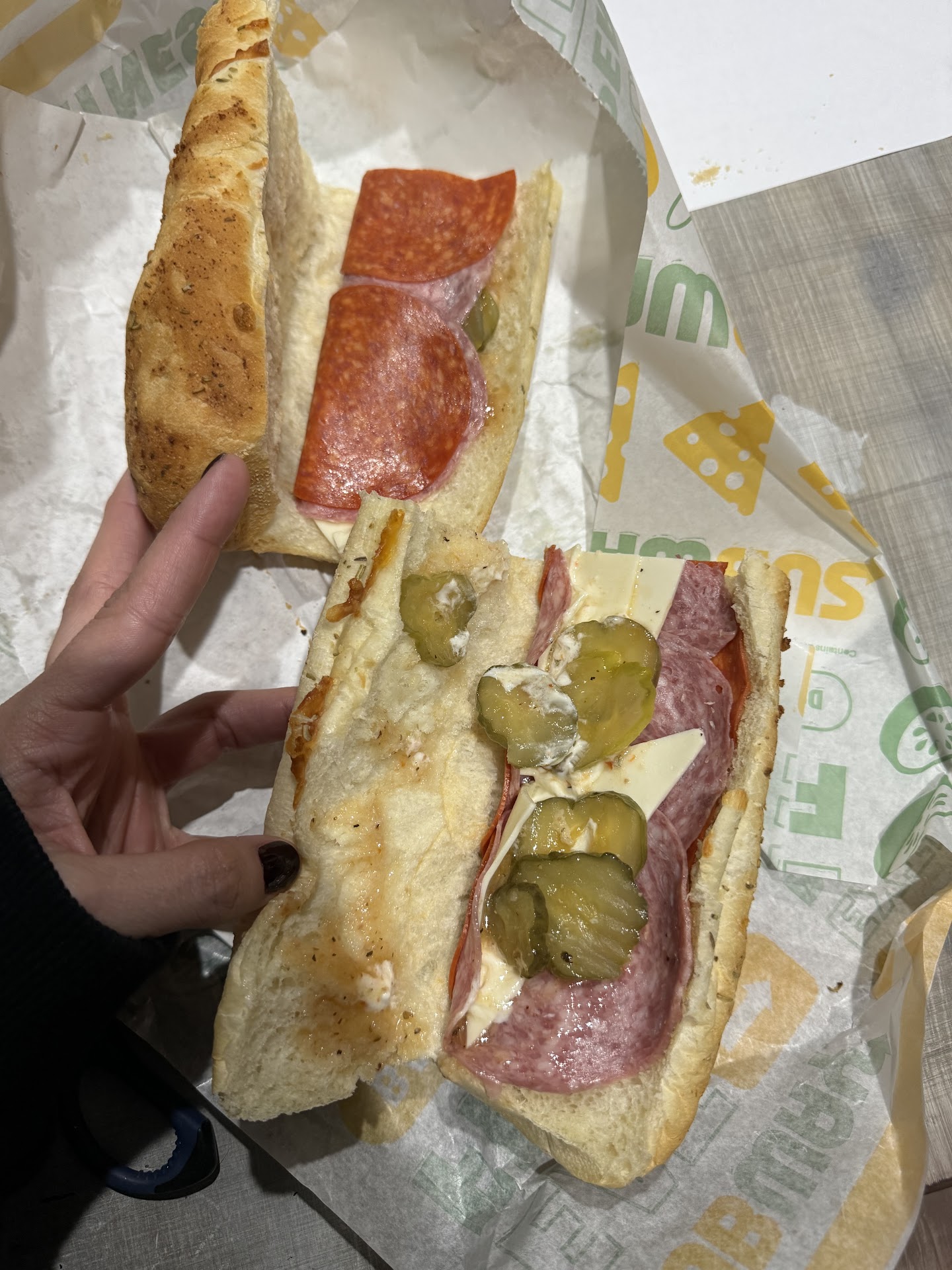 Honestly the whole experience was pitiful. The two girls with pink and blue hair were unkind and absolutely no help. Basically threw my receipt at me and I got no thank you or have a good day. My daughter gets a double cheesy roll up with pickles inside. I was told they are unable to do that bc the cheesy roll up only comes with cheese and it’s “policy”, I’ve never been denied this before so instead I asked for a side of pickles which they gave me for free. I’m not complaining about free pickles but if it’s no up charge why couldn’t you put it inside the roll up? Subway lost money by giving me a bag of pickles instead of putting them inside the roll up. I asked them to charge me for whatever to make it possible to get pickles inside but they still refused. The roll up is supposed to be double cheese. As you can see in the picture it clearly only has American and only the tiniest bit. The roll up is embarrassing and I’m shocked they let stuff like this slide. I asked for my sandwich to be toasted but the meat was still cold. They also didn’t slice my sandwich. My mother went with me. They refused to put sauce on the meat instead of next to it. What does it hurt to appease the customer? I felt alot was out of spite. Definitely don’t recommend...