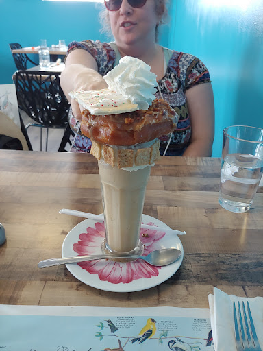 The end of a magical meal that caught both of us by surprise (so glad I pushed to try it out!) had me wistful and the handwritten sign just above my friend's head proclaimed $10 signature artisnal milkshake creations.... Suffice to say I made a bit of a compromise with my inner guilt/shame [to-go box ordered for the non-liquid part of this dessert] and ordered the one at the top of the list (specific name lost to the caloric haze) it featured coffee ice cream topped with whipped cream, and the glass was rimmed with homemade icing to which a popular crunchy toasted cereal with a cinnamony sweet taste were affixed...and the whole soda fountain dream was topped with a locally-made bacon-encrusted glazed donut into which half of a pop-tart had crash landed. So my initial apprehension of the largess of spending another $10 on a milkshake which I certainly did not require was quickly cast aside. It bears repeating that I was disappointed that they were going to be closed the following two days - for both my friend and I wanted to try more things (but live 2 hours away).