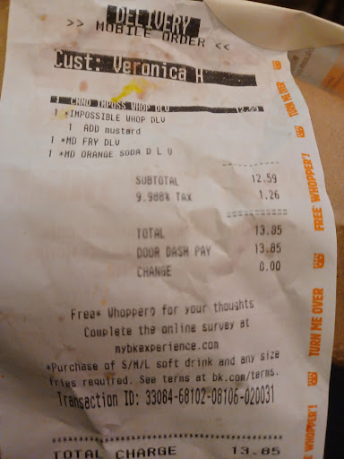 Ā Ā Ā Read moreI pay for a $54 order to be delivered to me both bottles of water are missing both orders of my 8 count jalapeno poppers my large Oreo chocolate shake!! I clearly ordered, paid for,and receipt states, "FIVE DOUBLE(DOUBLE MEANS 2 PATTIES!!) AND I RECIEVED NOT 1 BUT ALL 5 JUST SINGLE PATTIED CHEESEBURGERS !!!???!! My suppose to be double(2patties) cheeseburgers we're. Not one mistakenly but ALL single(means 1-solo, uno) patty burgers?..! Like,. HOW difficult is it? ITS NOT! Follow instructions,slow down.. Its not ROCKET SCIENCE ! JUST PLANE READING AND COMPREHENDING WHAT URE READING. OR IN BKS CASE SIMPLE KID MATH- COUNTING. HOW MANY PICTURES OF BURGERS ARE ON THE P.O.S SCREEN, DIRECTLY INFRONT OF YOU!?! SCREW THE RUSH OR PLANE INCONSIDERATION MAYBE?.. I.D.K.BUT I DO KNOW ITS just KNOWING HOW TO READ and MAYBE .Take Your Time and it really wouldn't happen! Whose to say I was allergic to whatever, i state for my order but prep cant or just doesn't read makes whatevers close enough, rushing or not comprehending r just not caring _?!.. yea _company lawsuit.. Stealing $1 dollar and stealing $5 is still stealing! What happen to customer satisfaction, customers being #1 priority and each customer receiving undivided attention to there orders and service each individually. Ya know, we customers only keep the business open. We provide the cash flow to need service workers . Like,this.is.BAD.. f*BS!! Forgive me, but how do u not understand bottle water or jalapeno poppers? Like its on ure freaking menu, or was the 2 orders of 8 each and 2 water bottles to high to count?!? Excuse me for my french!! Im done. Nope! not yet;I I am very disappointed- a bit upset to say the least. Obvi.. that's a lot of money for nothing and for what was received to be wrong-Completely! O good job on the fries and on the already packaged Hershey pie -I paid for guys. oh and the drink actual size Cuddo's fareal to the fry&drink maker,/ pie...