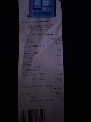 Ā Ā Ā Read moreEverytime I order here from DoorDash I never ever get all my food. Iām a content creator and I really wanted to review the Wendyās Wednesday meal and they didnāt give me any of the sauce like what was the point of the meal without the sauce. When I tried to review the SpongeBob meal same thing no sauce on my burger. Iāve even went inside and tried to order and was told they only except cash no cards. Also itās been times Iāve went inside and the cashier was rude donāt speak stand at the cash register with an attitude store filthy. Iām so tired of this store it donāt make no sense please get some new employees and new managers and I will be reviewing this store on my TikTok @ciaramariewhalen please come watch and see for yourself I will not be getting nothing from this store again today was...