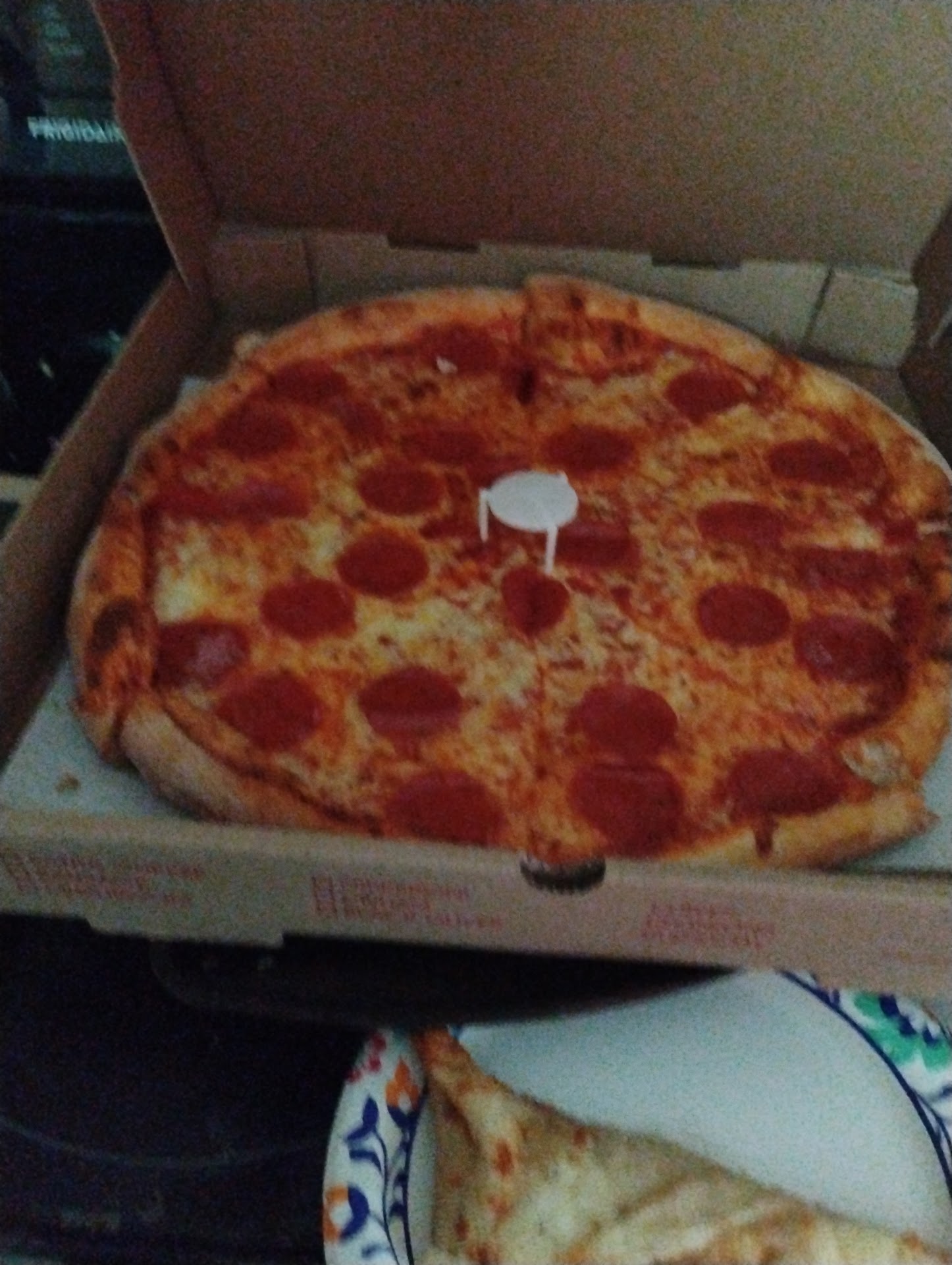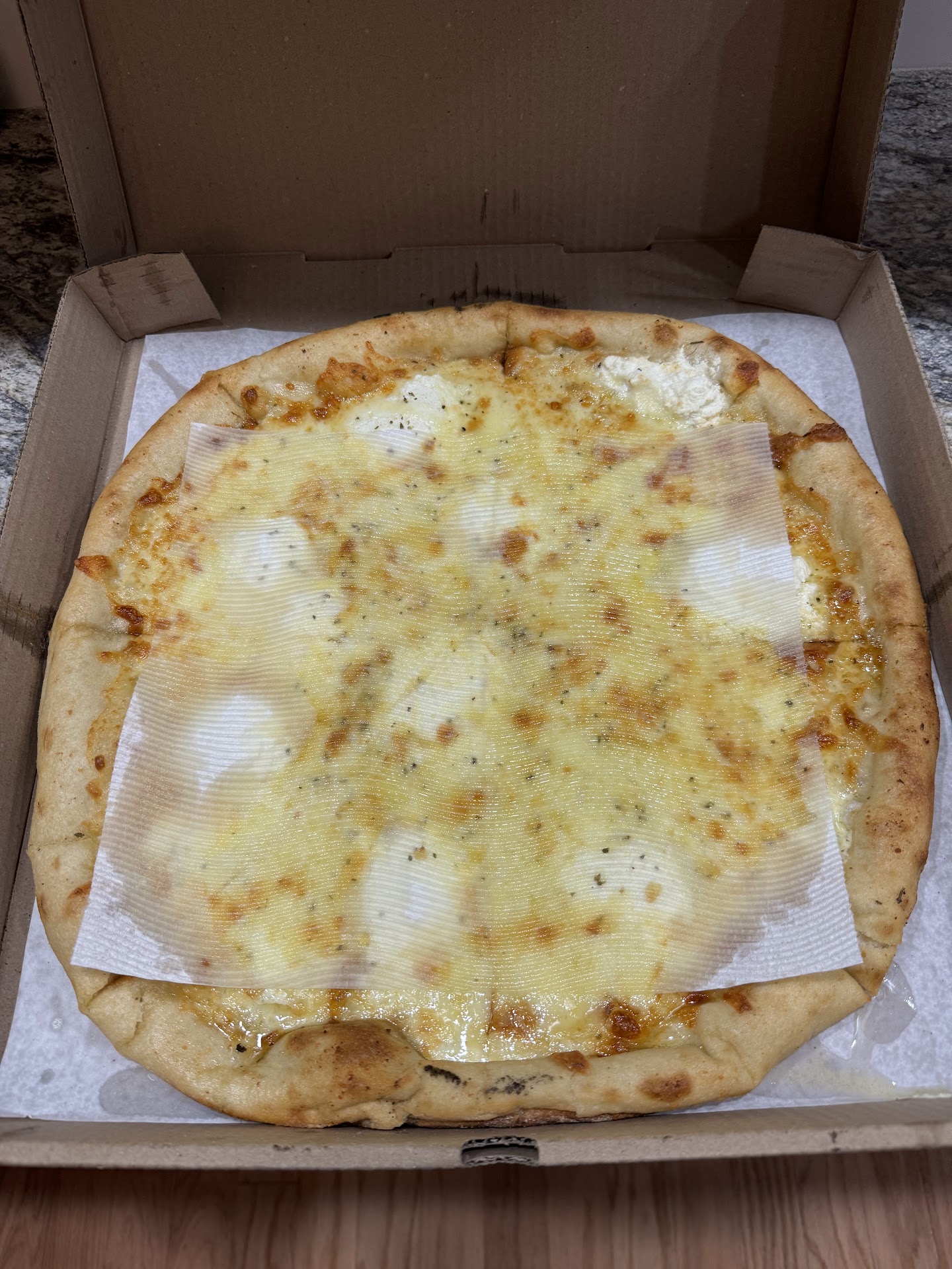 The first pizza I bought (7 Deadly Cheese, $19.99) was just greasy gobs of cheese. I understand cheese is the point of 7 Deadly Cheese, but it just tasted like cheese, no other flavor. The pizza was DRENCHED in grease/oil (the first picture is a paper towel on the pizza, absorbed almost the entire paper towel in grease/oil. The crust was SUPER THIN and floppy. Even when trying to reheat the pizza the next day, the thin crust just went from wet and cold to warm and brittle. The onion rings I ordered were also really greasy, but otherwise okay.
