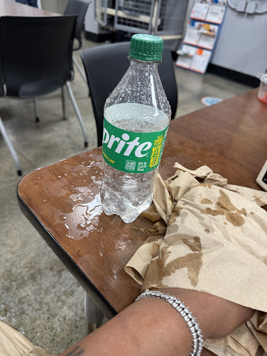 The Sprite explodes like a shaken-up firecracker. Soda EVERYWHERE. My clothes — soaked. My food — drenched. My phone — sticky. My mood? Unrecoverable.