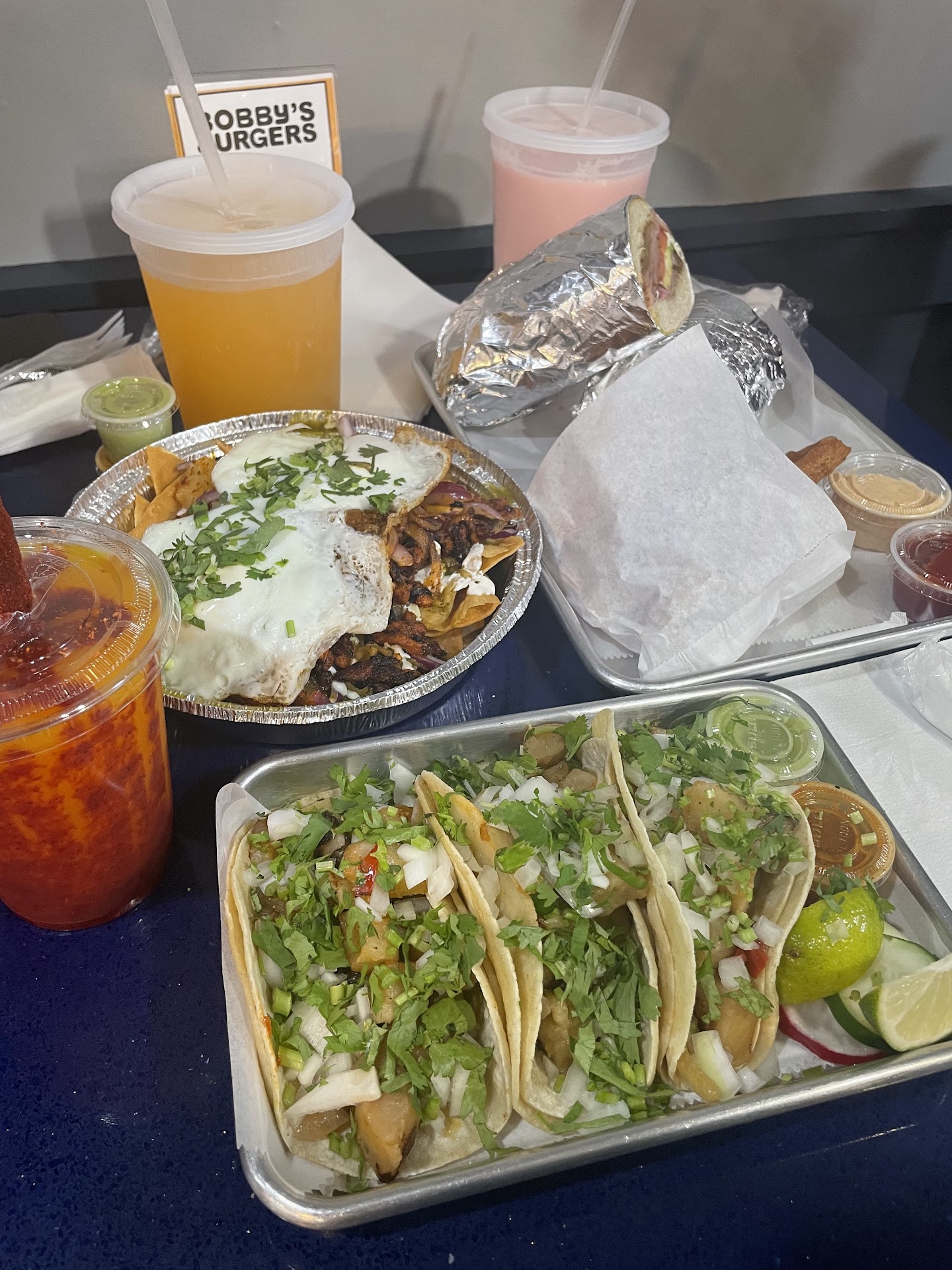 Read moreme and my friends went at around 9pm for dinner and had a great time :) woman taking our order was very friendly, and for everything we ordered food came out pretty quick approx. 15 minutes. i ordered the potato and jalapeno tacos and the chamoyada, one friend ordered the al pastor chilaquiles with the melon aguas frescas, and other friend ordered the hawaiian torta with the strawberry aguas frescas. all three drinks were incredible, sooo refreshing! my tacos were tasty and filling, but bland; i needed to order a side of pico de gallo and black beans to add and that made it 100% better. side note, the order of black beans were particularly delicious, very well seasoned! the chilaquiles were amazing, and the torta was just okay. the best part of the torta were the sizeable order of onion rings they came with. the vibes in the area are very lowkey, we were able to chill there for some time. overall a very nice experience,...
