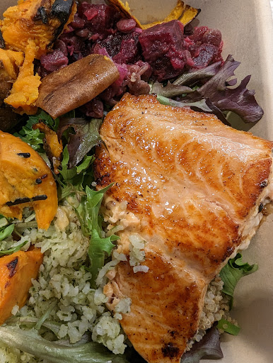 Quality Greens has a similar protein and veggie mix, but everything is cooked better. Salmon seems to be broiled there, as opposed to pan fried and flipped at Little Beet. Also, the standard doneness at Little Beet is "well done" and they don't seem willing to do a proper barely-done. They do use much less oil at Little Beet than Quality Greens -- so decide your tradeoff between health and tastiness. Portion sizes at Little Beet are a bit smaller and a touch pricier.