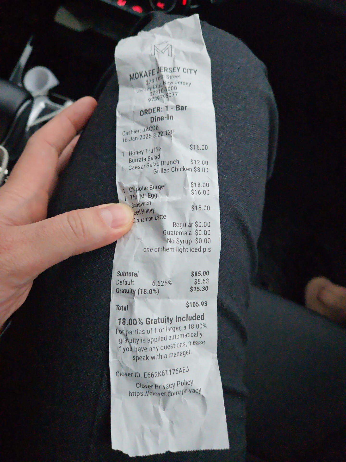 We ordered ceasar salad, burrata salad, chipotle burger and egg burger. We got honey chai coffee that was so sweet I didn't even touch it after first sip. I was surprised that they brought all the food together even when I asked if we can start with salad. Salads were ok, rest were not worth the money. First, we received dirty utensils which can happen i guess. I kept asking waitor if we can get a table since there were so many tables freed up. We didn't get help because it seems like there was a little fight between the waitor and waitress. It was pretty uncomfortable to eat at the bar while this was going on and food being mediocre/terrible didn't help. At this point, I just wanted to eat my food and get out. I asked for check. 18% gratuity was included already. I wish I could have not given any tip. I've lived in JC over 20 years and been to many cafes in downtown jc. This by far the worst. I will do my best to let everyone I know to stay away from this place. Yuck