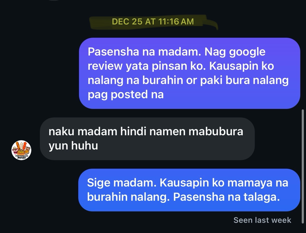 Their statement was completely false, intended to protect their reputation. Yes I understand, while criticizing someone's personality is wrong, revealing the truth is also important. She portrayed me as a bad person and a liar, but I had messaged her to address the issue. I felt her apology was insincere and she didn't make an effort to resolve the issue. If you read her messages, was it sincere after all? I felt like she was rushing or pushing me away. I wasn't seeking free things, but rather a sincere apology and a good resolution. Everyone was disappointed with the food, and some relatives warned me about leaving a bad review. However, I CHOSE NOT to because of our good relationship, and even sent her a warning message on December 25 (check out her screenshots) Do we have the right to be upset? Yes, because that’s a SERIOUS HEALTH RISK!