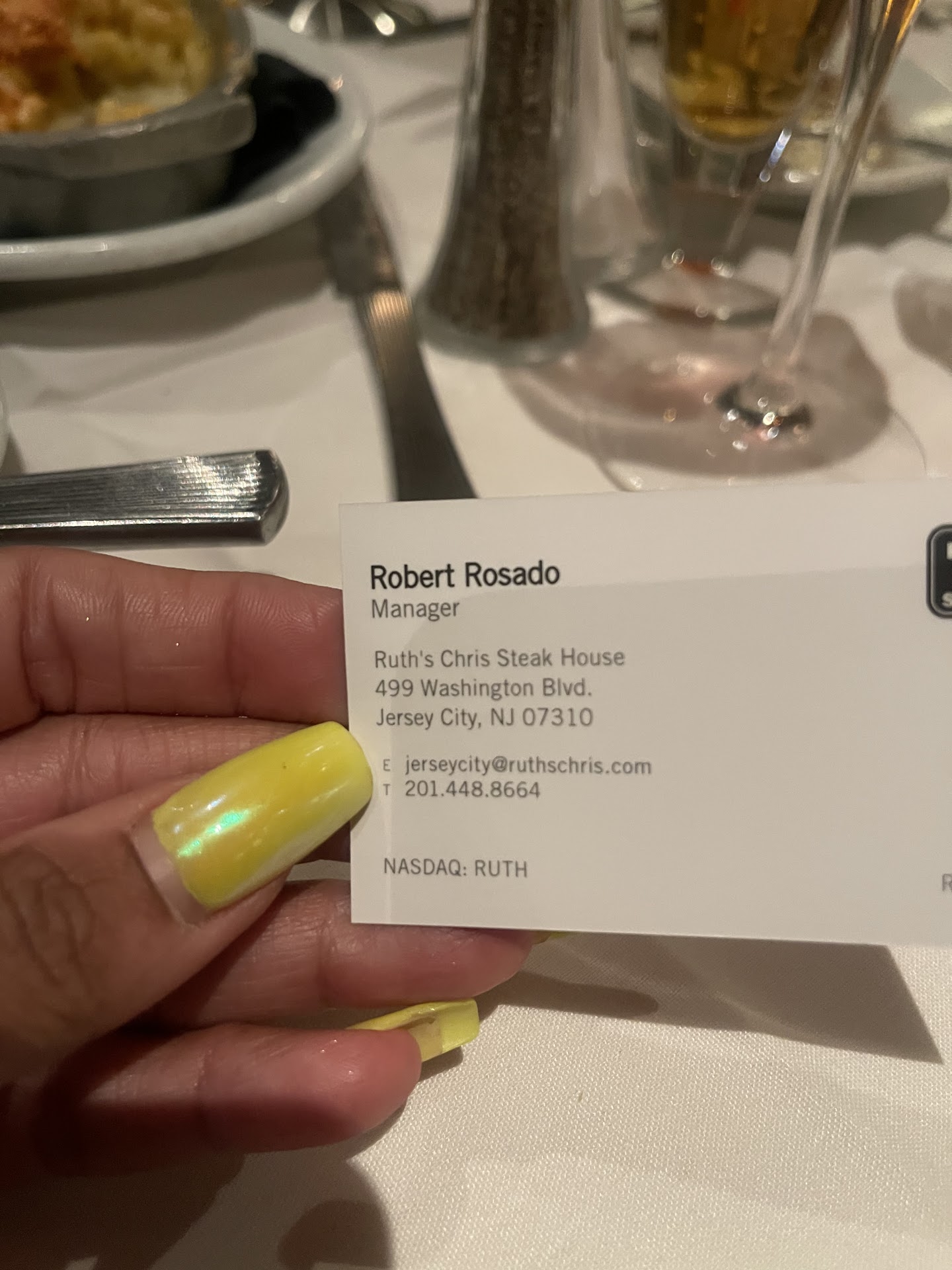 Iâve been to other Ruth's Chris in the past and this was not the quality Iâve experienced in any other one except this one in Jersey City. I would grade the food a 4/5 and the hospitality a 0/5. Really poor job. Despite our waitresses best attempts, the meal truly was soured from the beginning when the hostess left us standing awkwardly in the middle of a restaurant for 5 full minutes despite bringing the chair issue to her attention. I do not recommend going to this Ruth's Chris at all if these issues are...