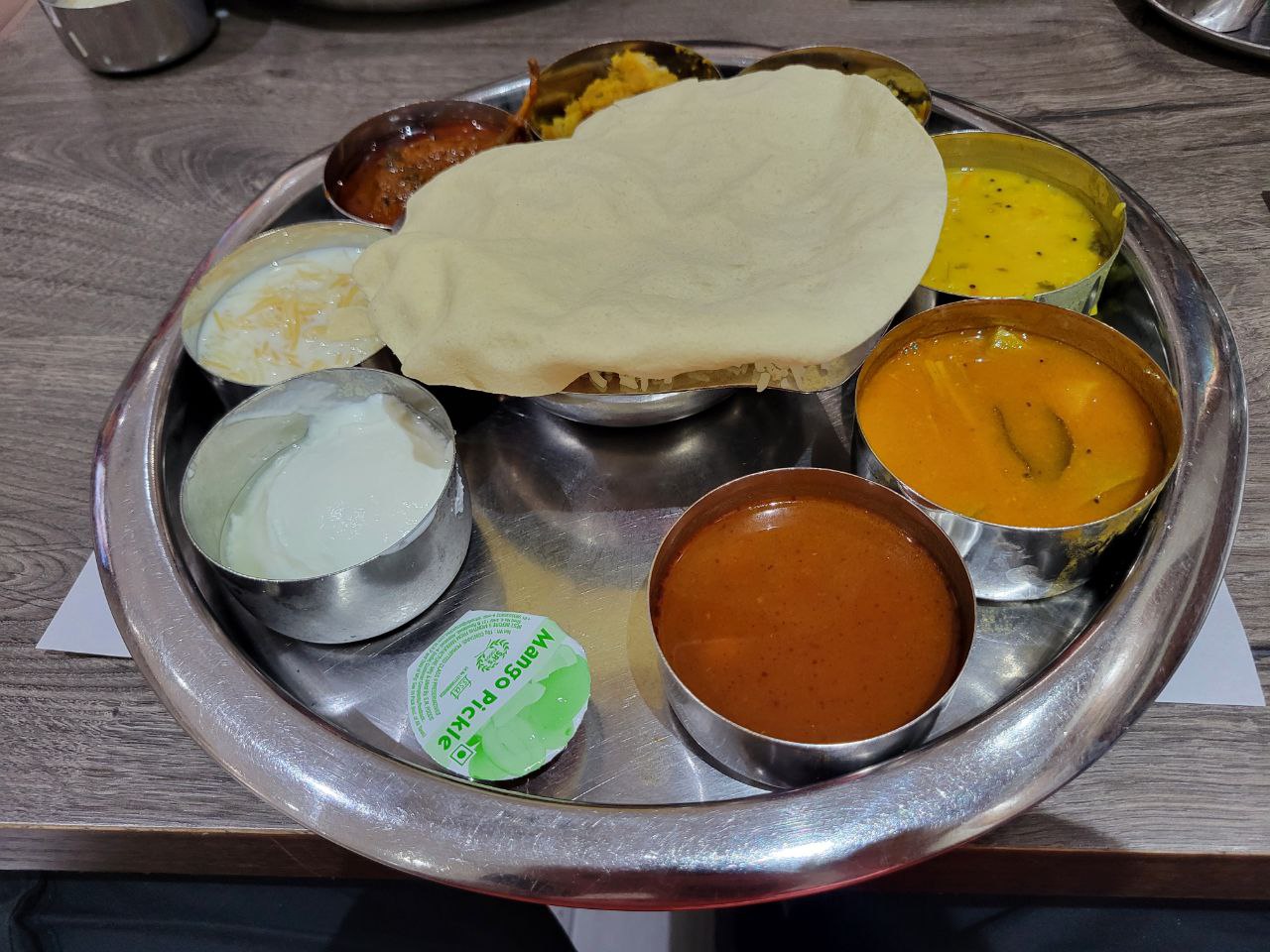 Read moreWe were down on Newark Ave for Indian, and the girl insisted on dosa. Being a Tuesday and remembering the great reviews here, we happened upon Sapthagiri's dosa and dishes buffet. Even if it's vegetarian, for $10/12 that's hard to beat for dinner. The place has basic decor, fairly tight table density, is well lit, and the service was good even for a buffet. I wasn't blown away with what I ate, but it was cool to try so many things and it was definitely worth a shot. I had a variety of things that I couldn't recount if I tried. Seriously, I attempted to try everything they had with mixed results. The buffet ran almost the length of the restaurant. They included daal tadka, a basic dosa bar, a spicy potato curry, a paneer dish, a spinach dish, a salad, a nut based curry, a potato ball from this huge platter, 2 kinds of rice (1 fried), and a variety of sauces and accompaniments. My favorite item was the potato ball, with a number of items like the spinach and paneer curries vying for second place (flavorful despite lacking core ingredients). The dosa was too basic for my taste and the dough wasn't savory enough--I prefer Sri Ganesh's down the block. I did not like the daal tadka, which is suprising as I normally like the dish. The inclusion of rice pudding for a dessert was nice. The girl also ordered a mango lassi which came out orange, but was rich and delicious. I can see how this place got its rating, aside from the few misses. It seems great for vegetarians and all the dishes have unique flavors. On the other hand, I prefer other restaurants on this stretch of Indian cuisine, and I have many more to try. It's probably going to be awhile if I give this place another shot--this time...