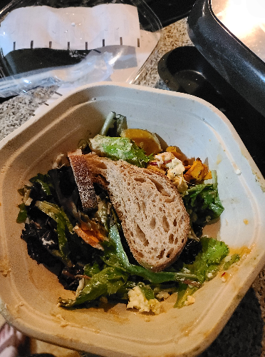 Yesterday I got a salad that was not only very small in portions, but the bread was stale and it felt like a gallon of dressing was dumped on it. Attached is a picture of my unappetizing salad for reference.