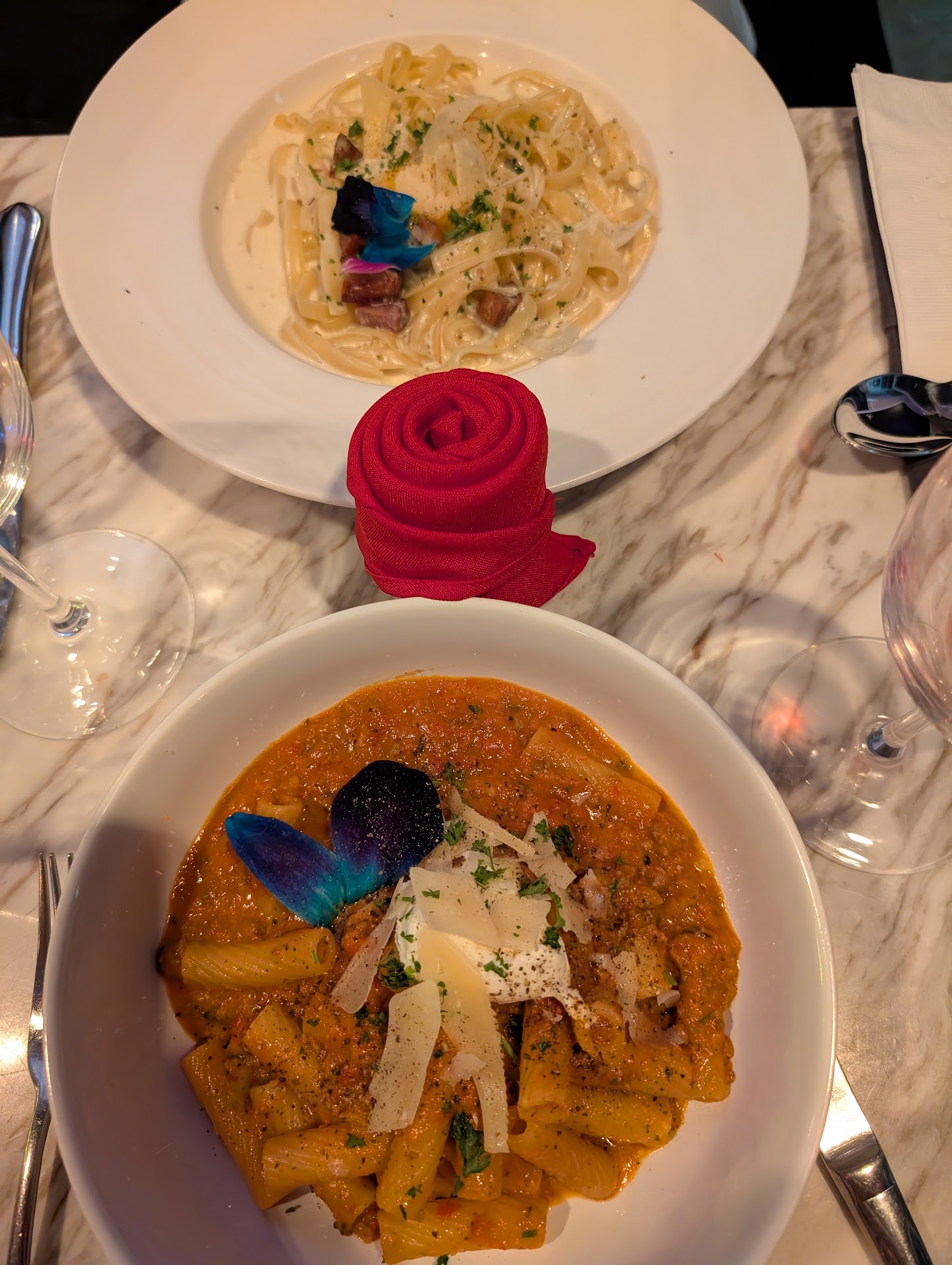 On the food: Burrata with fig jam 4.5/5, was delicious, but would profit from actual buffalo burrata for extra taste Charred octopus, 5/5 incredible and not chewy Carbonara 4/5, missing some salt, also not the traditional non-cream version, went too heavy on the cream in my taste Rigatoni bolognese, 3/5. Sauce was good, but pasta was undercooked. I don't mean al dente but proper undercooked