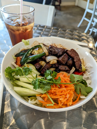This was a neat little place and wasn't quite sure what to expect as it's located in a run-down strip center on fm1960, but you're pleasantly surprised when you walk in! You order up at the counter and then they bring your food to your table. They offer a self serve iced tea or water and they also have a long list of other iced teas which I'll have to try next time. They have a great selection of Vietnamese dishes and looks like the Banh mi is a favorite here as several people ordered it. We started with a couple spring rolls with a yummy peanut sauce, they were a bit sticky but they tasted delicious! I got the combo vermicelli which came with your choice of 3 meats or egg roll, so I got the beef, chicken and egg roll. It was absolutely delicious!! The meat was tender and not dry, so flavorful and served with fish sauce and a good portion of noodles and veggies. You can add an egg to any dish for $1. My friend got the shaking beef and it looked delicious as well! The sauce and garlic on top of onions, noodles and veggies must've been good because my friend finished their plate! The seating area is casual but nicely decorated and the wall of pictures from Vietnam was fun to explore. During dinner there was a good flow of customers and I'm sure they're packed at lunch....