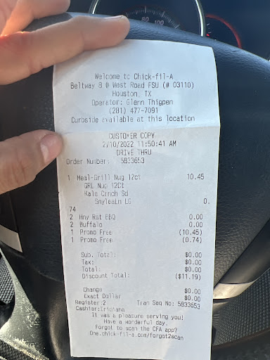 Read moreStopped by at 7:44 pm on 11-27 Juan was the manager on duty walked in & no one was at the counter I waited no one came so i asked the manager Juan who was working in the drive thru was it someone to take my order he said wait a minute well that minute turned into me asking him two more times & five minutes later with the same response. I asked him for Corporate number he told me it would be on my receipt when I order i told him why would I order something after waiting more than 5 minutes which is ridiculous & I needed the number he walked over with a attitude hit some key on the register & receipt tape printed out never even trying to correct the issue or anything he had the attitude as whatever. But after pulling off & looking at the receipt he printed the last transaction from a sale with all that customer credit card info on it the last 4 of the card number card description ect . And he's the manager so this is what chick-fila turning into now terrible service & by the way take the previous customer credit card info these days the wrong person could really turn that info into a nightmare for...