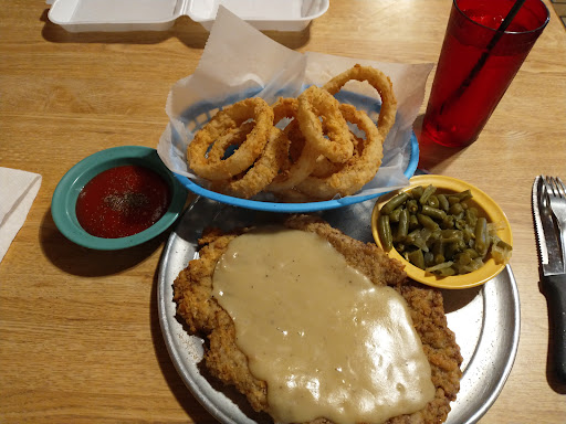 I had the "medium" size chicken fried steak, green beans and onion rings. Onion rings are not a "regular" side and cost $2.99 extra. Worth it. SEE PHOTO As soon as I received my pizza pan covered in food, I asked for a to go container. Immediately cut the CFS in half and placed it in the to go container. Only half of the "medium" CFS was plenty. Green beans were seasoned nicely. They appear to be typical from a can but you can taste the bacon and other seasonings they use in the beans. The onion rings were flaky, crispy and hot out of the fryer. I like ketchup with my onion rings. The CFS was covered in cream gravy. The meal was a great value for the price.