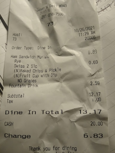 Read moreHello, My family and I recently visited the Jasonâs Deli on the corner of Hwy 6 and FM 529. My wife first noticed the restaurantâs dirtiness when she went to the restroom. When she saw the large biohazard in the restroom she notified an employee and she was told that someone would clean it immediately. Over the duration of our visit she noticed that an employee never went to the restroom to clean the diarrhea off the floor and wall. My wife never mentioned anything to me during the visit because she was still optimistic, but if she had we wouldâve NEVER eaten there. Afterwards, we concluded that the restaurantâs lack of cleanliness extended further from just the restroom because many of the tables were left dirty. We saw one table that was a complete mess, including the floor, and an employee did not clean it until at least 30 minutes after we had sat down. There were employees milling about, so it was not an issue of understaffing. After our visit yesterday we decided that we would NOT be returning. This used to be an establishment that we frequented, but started to visit less often because of its decline in quality, but the lack of cleanliness is what is deterring us from ever returning again. Itâs disgusting that this previously pleasant restaurant has deteriorated to such a nasty state. I write this message because any business that operates this way should be ashamed...