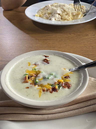 The food and service was excellent! Definitely recommend the fettuccine alfredo with chicken , the pasta was cooked perfectly and the sauce was very creamy. The potato soup was also really good and flavorful. I took a slice of tiramisu to go and am enjoying it as I type this review. I will be coming back and will likely try the pizza next time as the table next to us ordered it and the smell...