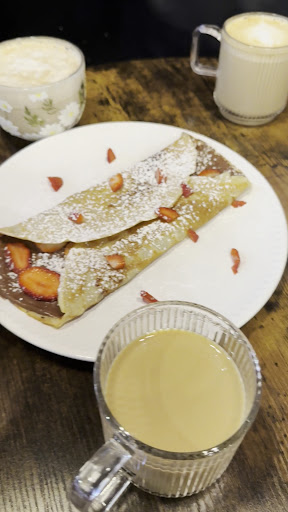 To accompany our coffee, we ordered a Nutella and strawberry crepe, which was absolutely delicious. They didnât hold back on the fillings or toppingsâevery bite was packed with sweet, creamy Nutella, fresh strawberries, and just the right amount of powdered sugar and drizzle. It was indulgent but not overly heavy, making it the perfect treat. We also tried a slice of their lemon poppy seed cake, and it was another winner. The cake was incredibly moist with a vibrant, citrusy lemon flavor that really stood outâexactly what you hope for in a dessert like this.