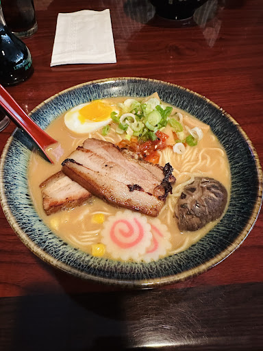 My husband ordered the spicy tonkatau ramen and he enjoyed his fully. Ate everything and drunk all the broth. The ramen I ordered was the miso flavor, with some spice. The charred pork was juicy and was easy to bite/chew into. My green onions, mushroom, egg, rice cakes and other toppings were great. Nothing over powered anything. The broth was smooth and delicious. I really enjoyed that mushroom too though. Packed a lot of flavor š And the chili topping was just the right amount of spice š