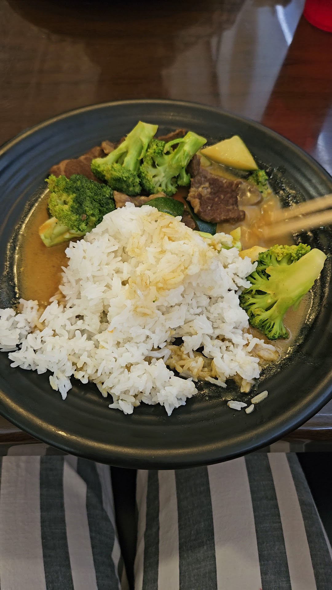 Chicken with white rice and golden curry sauce: 4.5/5. Very, very mild in spice and flavor. It was delicious, I was just thinking a little more zip. Everything was perfectly cooked!