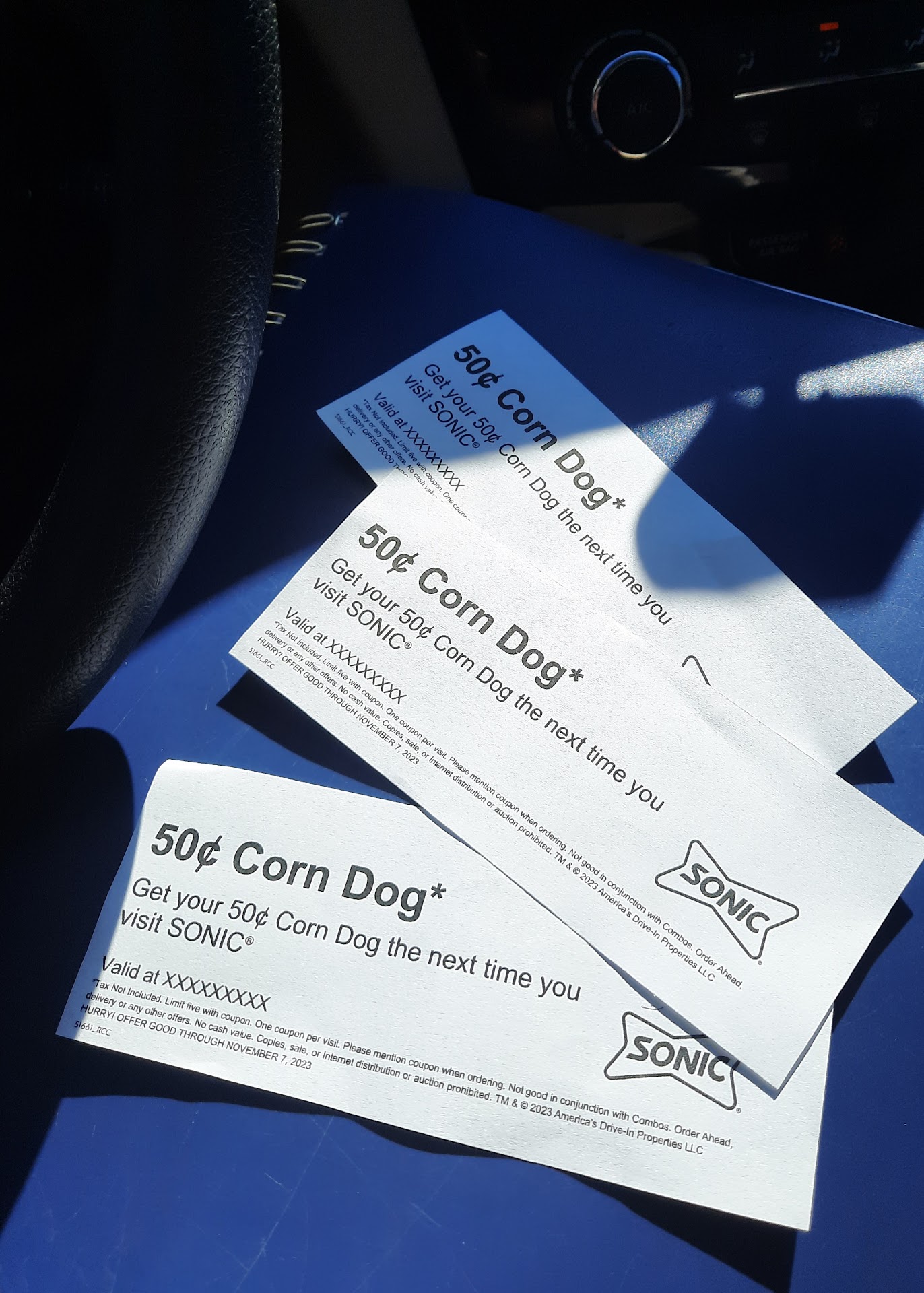 Read moreFor the past 3 or 4 days this location had been advertising corn dogs for fifty cents on Halloween. I waited in line for about 8 minutes to place my order. Once I got to the box I ordered seven corndogs; I was then told that they were sold out, but I would be given a coupon for the items I wanted to order. HOWEVER, once I got to the window, I was only given three coupons from the young man. When questioned if these would cover the seven I wanted to order, he simply said, "No ma'am." Then when I asked, what about the other for, he spoke to someone & then said, "My manager told me to only give you three." So first I wait in line to order, then I had to wait AGAIN to get my rain-checks/coupons only to be shorted!!!!?! Like REALLY! I should've gotten out of the line & pulled off like everyone else were doing! Not to mention, they had a hand written sign up saying that they were OUT OF ALL SODAS! Someone needs to go back to training or get demoted. A holiday that you've been advertising for and you run out of basic supplies?!...