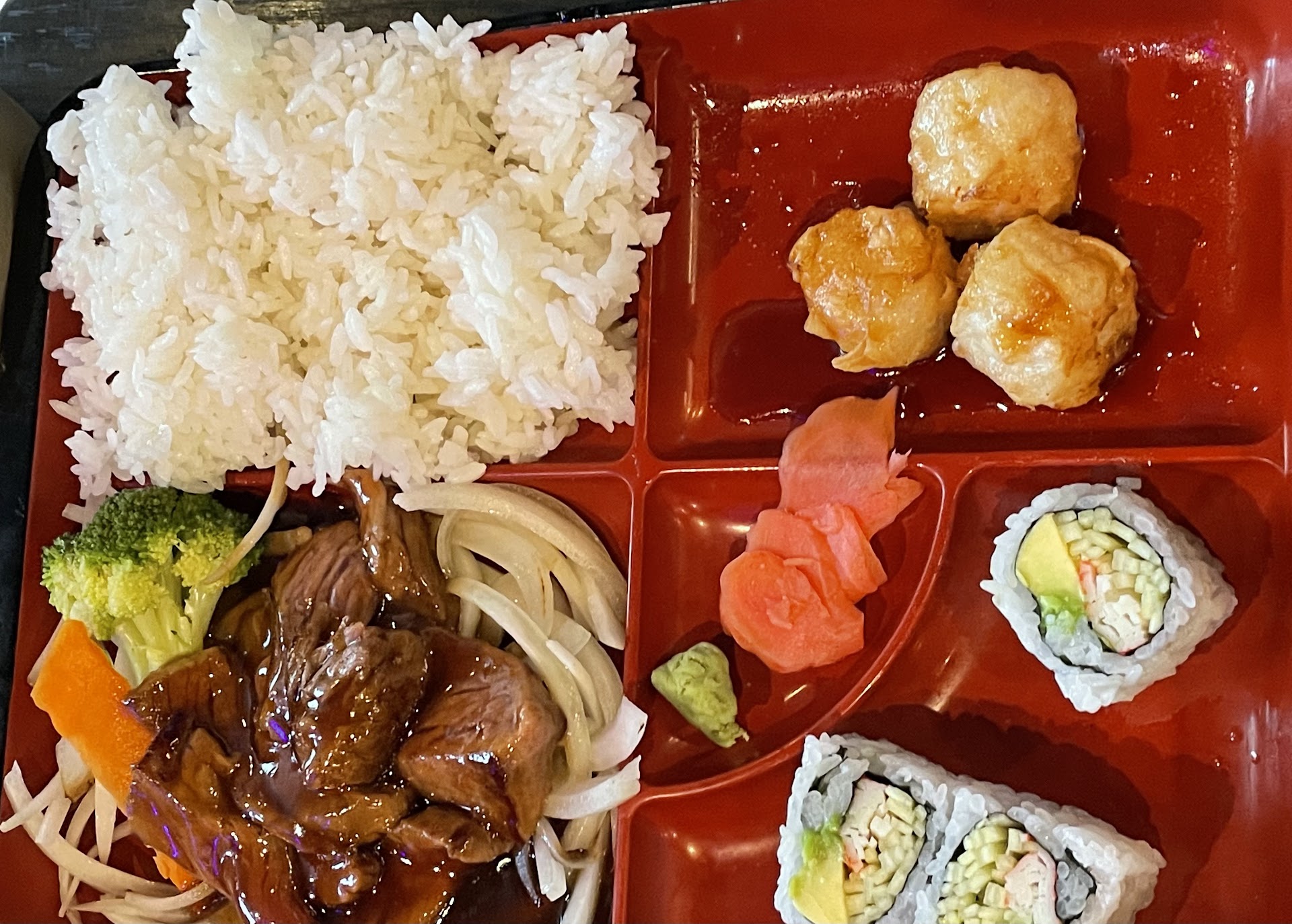 The pictures on this page were very deceiving, judging by the pictures and the reviews we thought it would be a good meal, but we were misled. We arrived at 1 pm for lunch Saturday and were told that they don't do lunch on the weekend and to look at the dinner options. They were the same items as lunch, just more money. All they really had to choose from that's not sushi was Hibachi, Teriyaki and Red Curry. We ordered one Red Curry, one Shrimp Teriyaki and one Chicken Teriyaki. The Red Curry came with no appetizers but the other two did so one person could not eat, all it was anyway was Chicken Broth in a bowl which tasted like powdered bouillon, no meat or anything in it, just broth. Also a very small salad, just iceberg lettuce and one cucumber slice with what appeared to be mayonnaise and ketchup mixed together with a touch of sesame oil. Then came the entrees: The Chicken and Shrimp were served on raw onion strips, nothing else on the plate except two broccoli florets and two little strips of carrot. I would say the chicken was about 6 oz cut into strips with what appeared to be kikkoman bottled teriyaki sauce thickened with corn starch poured on it. The shrimp was the same exact way, 7 shrimp with bottled sauce poured on it on top of raw onion with the broccoli and carrot. They did come with what was about 6 oz white rice in a side dish. Neither of us ate the onion and only I ate the rice, even if we ate the onion it was a very small portion of food for 19 dollars. Just basic meat with sauce is all it was. The Red Curry dish had way too many snow peas in it, in fact it's about all it was and the sauce was too loose. The biggest problem though was that with all those snow peas basically being the only thing they put in the dish, they never took the time to pull out the stringy membrane strands on the back of the snow peas. So it was a very unpalatable mess with strands that looked like blonde hair poking all out of the sauce, the person eating it initially found it shocking until I assured them it was only that they never removed the stringy strands from the snow peas. They thought it was hair in their food and then they lost their appetite and did not finish the dish. So the three of us hardly ate anything to be charged over 60 dollars. Professional cooks should have known about the unpalatable risks of using snow peas if not prepared properly and to have nothing but raw onions on a hot plate of food. At the very least they should have been sauteed but even then, no one wants to eat just onions, there should have been a variety of vegetables in it. All in all, it was just very poorly executed and we obviously have no...