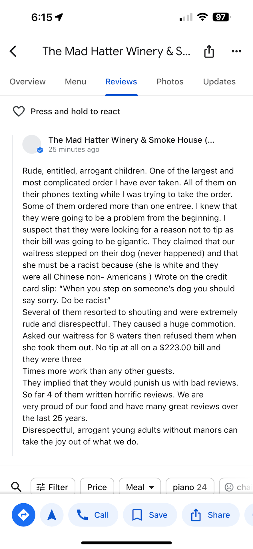It’s incredibly disappointing to see such an unprofessional and defamatory response from the management of this restaurant. Instead of addressing valid concerns raised by multiple customers, you have chosen to attack us personally, mischaracterizing our behavior, and resorting to baseless accusations. “Rude, entitled, arrogant children”: This is an uncalled-for personal attack that reflects poorly on your establishment. We are paying customers who expected a basic level of respect and service. Order complexity and delays: Yes, we were a large group, but we ordered straightforward meals—burgers and steaks—not an unreasonable or complicated request for any restaurant. The issue is not the size of the group but the fact that the food was excessively delayed, served cold, and improperly prepared. That is your responsibility to manage, not ours. Accusation of lying about our dog: The fact remains that your server stepped on our dog. Instead of offering an apology, she rolled her eyes and behaved dismissively. Denying this incident and labeling it as false is simply dishonest. Race-based accusations: Your comment implying we made accusations of racism because your staff is white and we are non-white is deeply offensive and unprofessional. Our complaint was not about race—it was about how we were treated compared to other customers and the overall lack of respect shown to us. Tips and your entitlement to them: Tips are based on the quality of service, food, and overall atmosphere provided by your restaurant. Your food was inedible, as you likely noticed from how little we ate. The service speaks for itself—unapologetic delays, cold food, and dismissive attitudes. Am I supposed to tip for the racial discrimination and blatant double standards we experienced? Absolutely not. “Punishment through bad reviews”: We have every right to share our experience publicly. Bad reviews aren’t “punishment”; they’re feedback for others to make informed decisions. Rather than taking accountability, you have chosen to gaslight and insult your customers.
