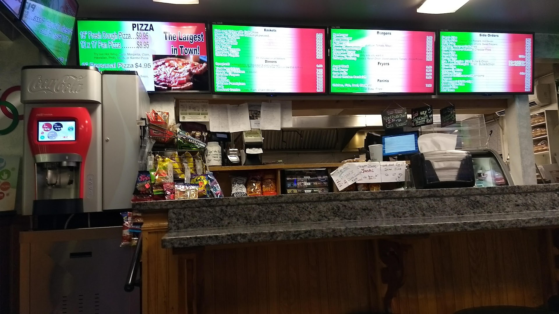 Nice little neighborhood sandwich shop with an eclectic mix of items: Coca-Cola Freestyle machine for fountain sodas, a wall of refrigerated individual sodas and beer, plus 40 oz. beer and 6-packs, plus 2-liters sodas, iced tea, and milk, plus a wide range of specialty sandwiches, a few salads and entrees plus pizza, either slices or whole pies. The desserts all look delicious: slices of cheese cake, individually wrapped brownies and some half pies.