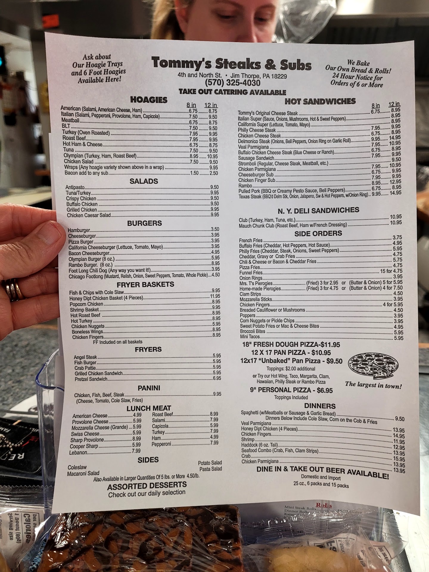 Pizza- they have ny style (large slice, thin flimsy crust) and a Sicilian (pan pizza on their menu). I'm always biased toward actual NYC pizza so Im overly critical on this one. But for $11(?) a pie, you wont beat it up in carbon county. The Sicilian is great with a light fluffy buttery dough. Toppings are your standard variety.