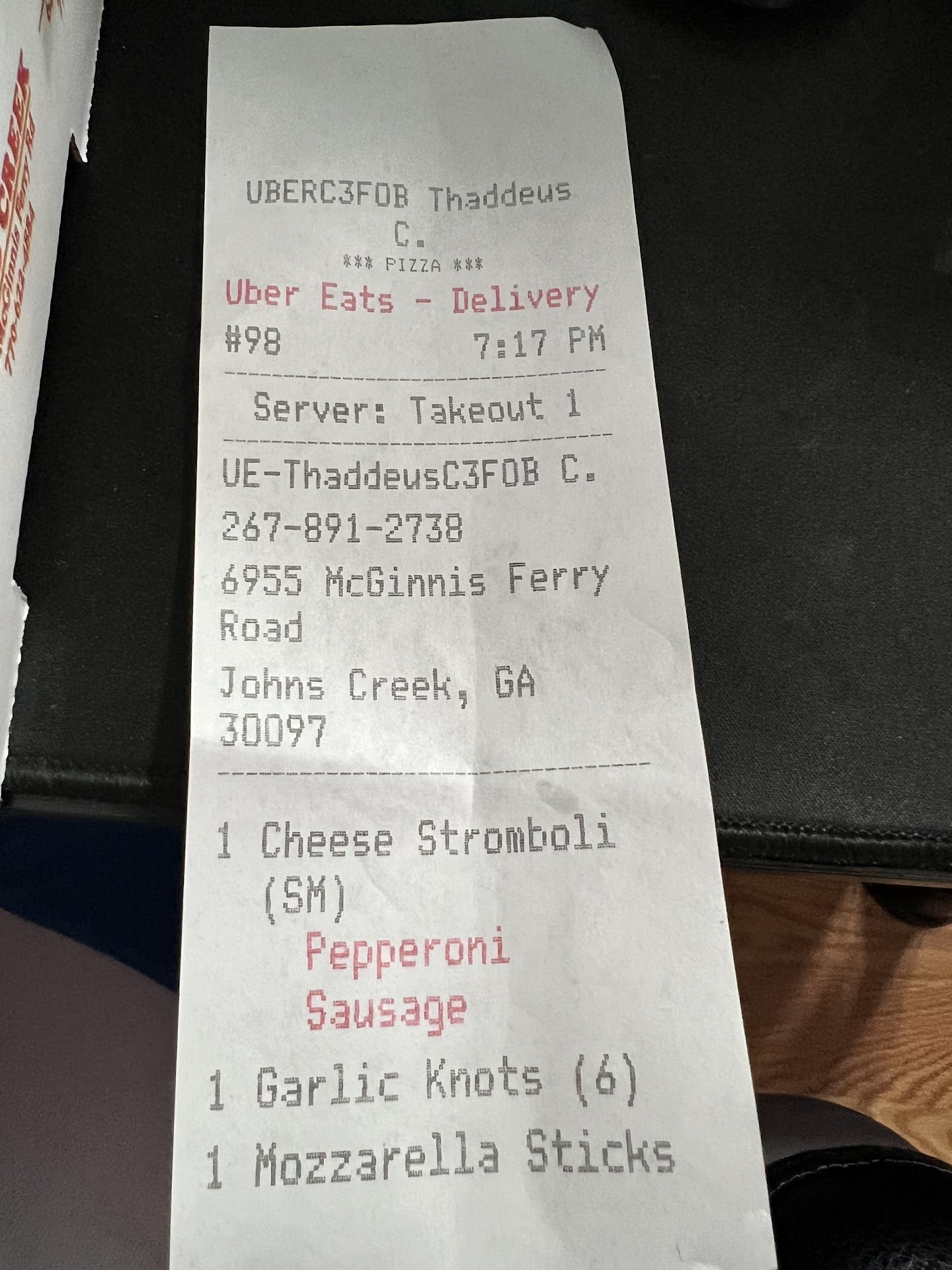Read moreStromboli was really good for the price, 8/10. I got mine with cheese and pepperoni. Still hot when it delivered and I would get it again. We also got garlic knots and cheese sticks.