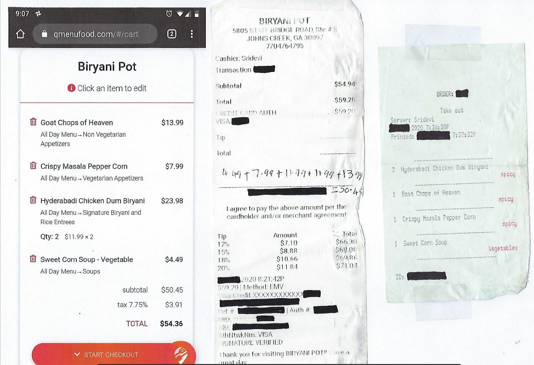 I have been a long time customer of this place, their biryani is good and consistent. I am disgusted with how this establishment overcharged me and handled the situation, hope itâs not their standard practice. I order over the phone and for the past few pickups, I felt that the bill was a little more than it should be. This time, I asked the cashier how much each item was, because they donât provide an itemized receipt. (1) I looked at the menu on the counter and the guy said those prices are old, really? (2) he started giving me prices by looking at the register screen, so I wrote them down on the receipt they provides and there was a $4.49 difference. He went and got the manager(big bald guy). Instead of apologizing and giving me a refund, this guy started getting defensive. (3) he said I shouldnât make a big deal about a few dollars +/-, so if I grabbed $5.00 from the register then they shouldnât care right ?. (4) he said other places automatically charge gratuity and I should be happy they donât do that, who charges gratuity for take-out ?. (5) he said the system hasnât been updated and that caused the error, the guy read the prices from the system so how is that possible?. The argument kept going in circles and the manager just walked away to the back without giving me my money. I shared my experience with my friends/family and this place has lost our regular/catering business. I wonder if this is their normal practice and what the math would look like if they are doing this with a lot of the transactions. Out of curiosity, I did an online order and saw the same $4.49 price difference. So if you order take-out from this place, I recommend doing it online vs the phone. Not much of a clean establishment, I saw the same person cleaning the floor, tables, serving the tables and no gloves. Even if they wore gloves, I doubt they would change them between cleaning floors and serving food. I am attaching screen shot of the online order vs what they charged me and I wrote down the item amounts the clerk told me on the receipt(which did not add up). This could have been simply handled, but the managers defensive behavior made it look like I caught them doing something they werenât...