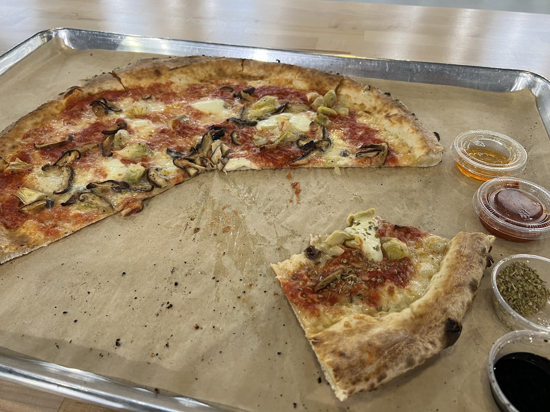 They’ve got a Coca-Cola Freestyle machine (Coke Zero for me 🥤), a cooler with Italian drinks, beer on tap, and — my favorite touch — a big metal container by the register with hot extra pizza sauce for dipping. It’s those small details that make the experience special.