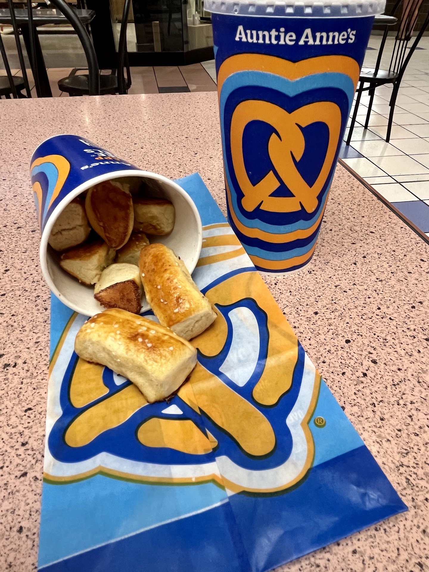 Tonight in Jc - I went to the mall specifically for pretzel bites . Started off as a joyous time until I went to the window to order ; the young teen you have working there looked un clean And a very unpleasant attitude ! I Asked her if the bites are fresh she said yes even tho they looked hard and dried up she made up some long story why they looked awful ; i said ok and still purchased a almost 6$ cup - took them to the table and you couldn't chew them it was like concrete - and tasted awful like they sat in a window for a year !! Went back handed me another dried up cup -- finally got them to make me a fresh cup .. yep that was like pulling teeth to have them do that !!!!! But the biggest issue was the workers had their friends standing there for over a hour !!!!! Talking & yelling and cussing I am a paying customer so I said something to them . The friends started cussing at me and the worker friend did the same ... her boss I'm guessing stood there and did nothing ..... and oh it took me 25 mins standing there getting my bites ...
