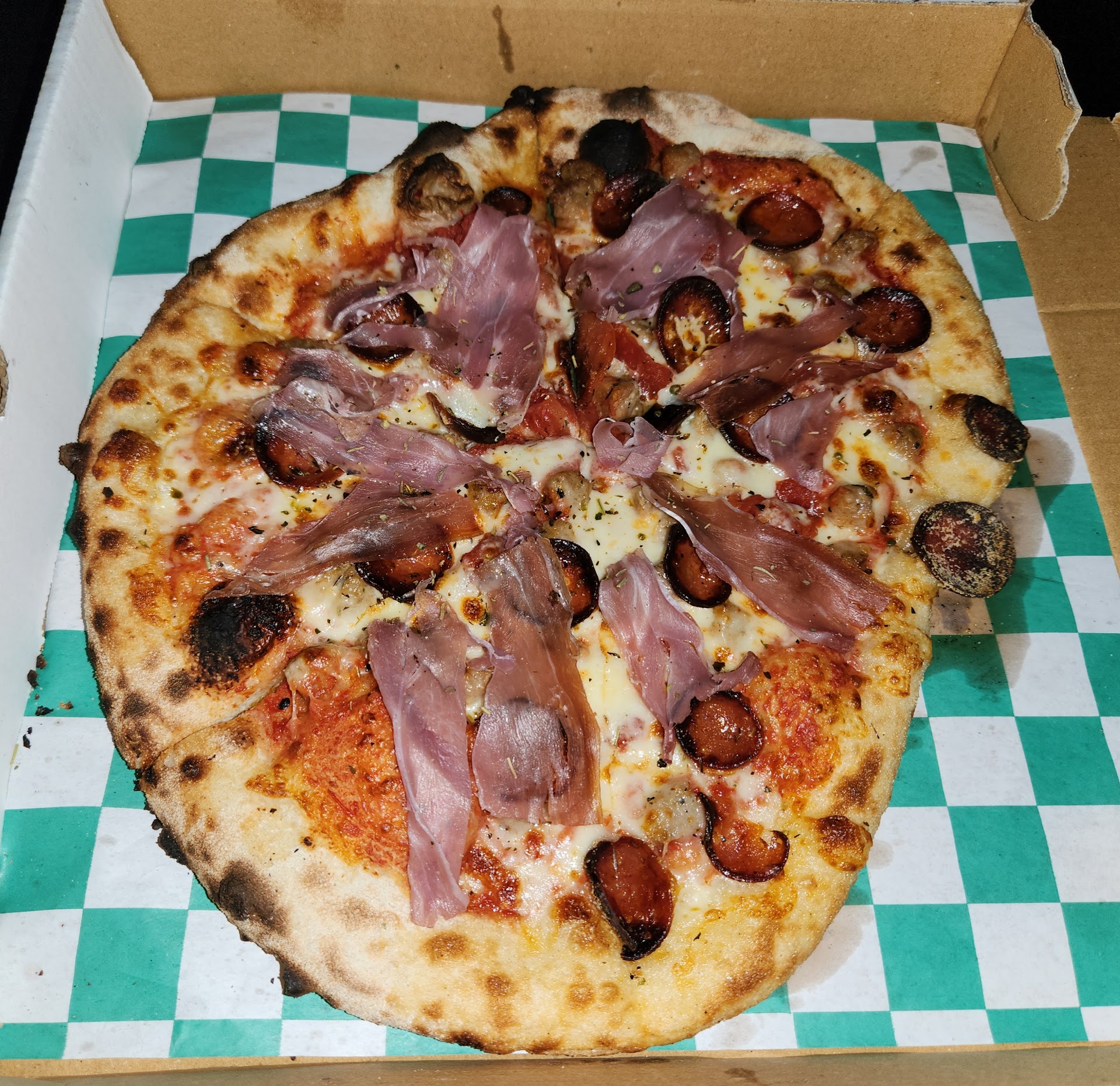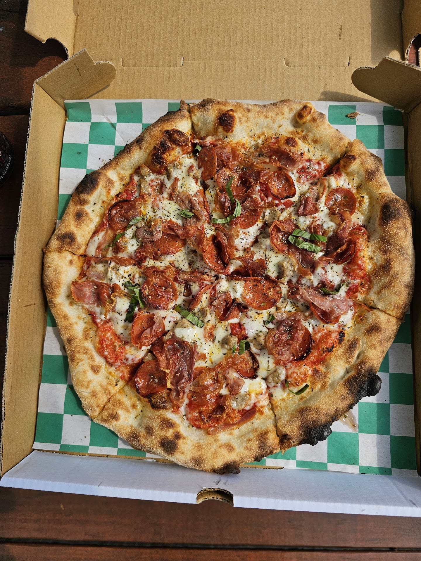 Would you travel two and a half hours to go to a wood fired pizza place? Well we did. (OK, we were also visiting our daughter.) We found this place searching on Google and decide to eat there. This is a food truck that is parked I believe semi-permanently 15 minutes south of Johnson city tennessee. They have imported Italian ingredients. They have a simple menu with 4 12 inch pizza choices a veggie, margherita, pepperoni and meat lovers and it looks like a rotating pizza which on this particular day, was a barbecue chicken pizza and a Hawaiian pizza. (To the owners, please correct me on anything I have described incorrectly.)They also have cheese bread sticks. We ordered the margherita and the meat lovers. The pizzas have a thin crust. The margherita was fantastic, it had the right amount of cheese and sauce that had small chunks of tomatoes that gave it a good texture, with fresh basil that added a sweet flavor. The dough wasn't chewy and had a nice crunch and smokey flavor. The meat lovers had a balanced amount of toppings and nice meaty taste. There are two metal tables with an umbrella with four chairs for seating and one picnic table with an umbrella. They have can and bottle sodas and water. They were fairly fast even though they were a little busy. If you are in the area or even a couple of hours away, I would highly recommend Basil wood...