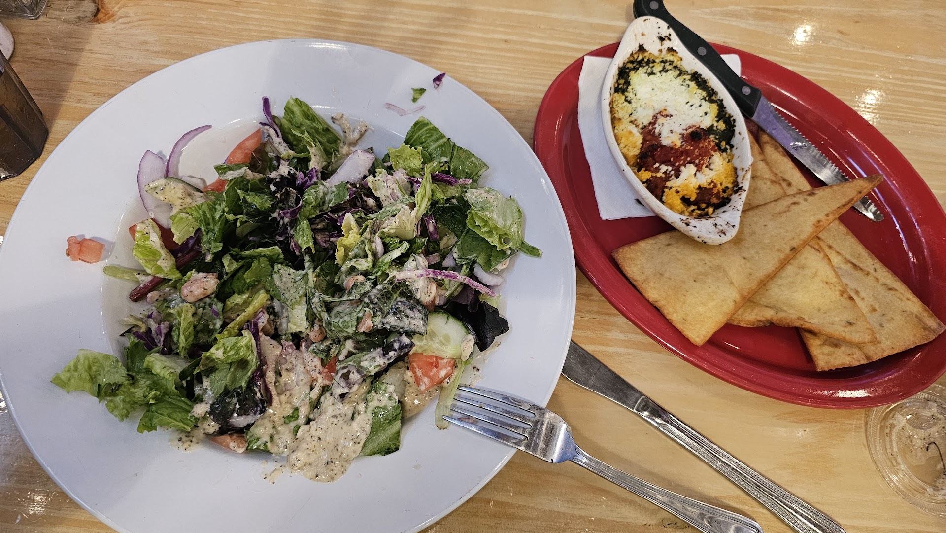 So I inquired with the server as to if we had the right salad. She said yes. Baffled, I asked where the goat cheese was as she brought us a second dish which had large pita slices and a small bowl of baked pesto and sun dried tomatoey paste with very little crumbles of goat cheese on top.