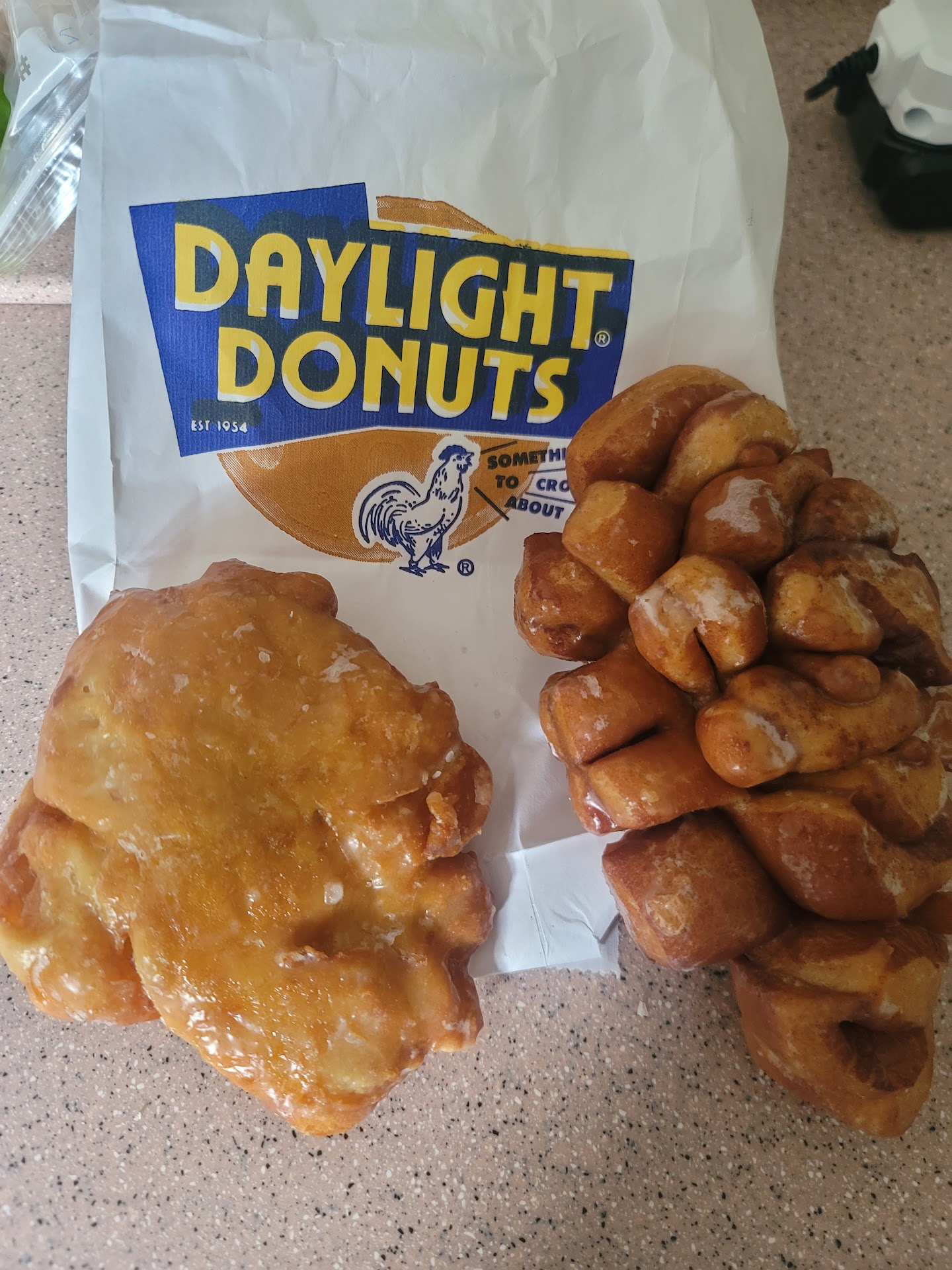 The Donuts: With so many different kinds, it was hard to choose. We tried a few different types of the hand cut, fresh made donuts. We had blueberry, chocolate and red velvet cake donuts, an original glazed, a maple frosted, a Hawaiian fritter and an apple fritter. The Cake donuts were super moist and cakey on the inside, and the light glaze made an excellent crust on the outside. The original glazed was probably the best original donut we have ever had, and the maple frosted was super good too. The fritters were amazing; chewy and soft inside, crunchy outside!.