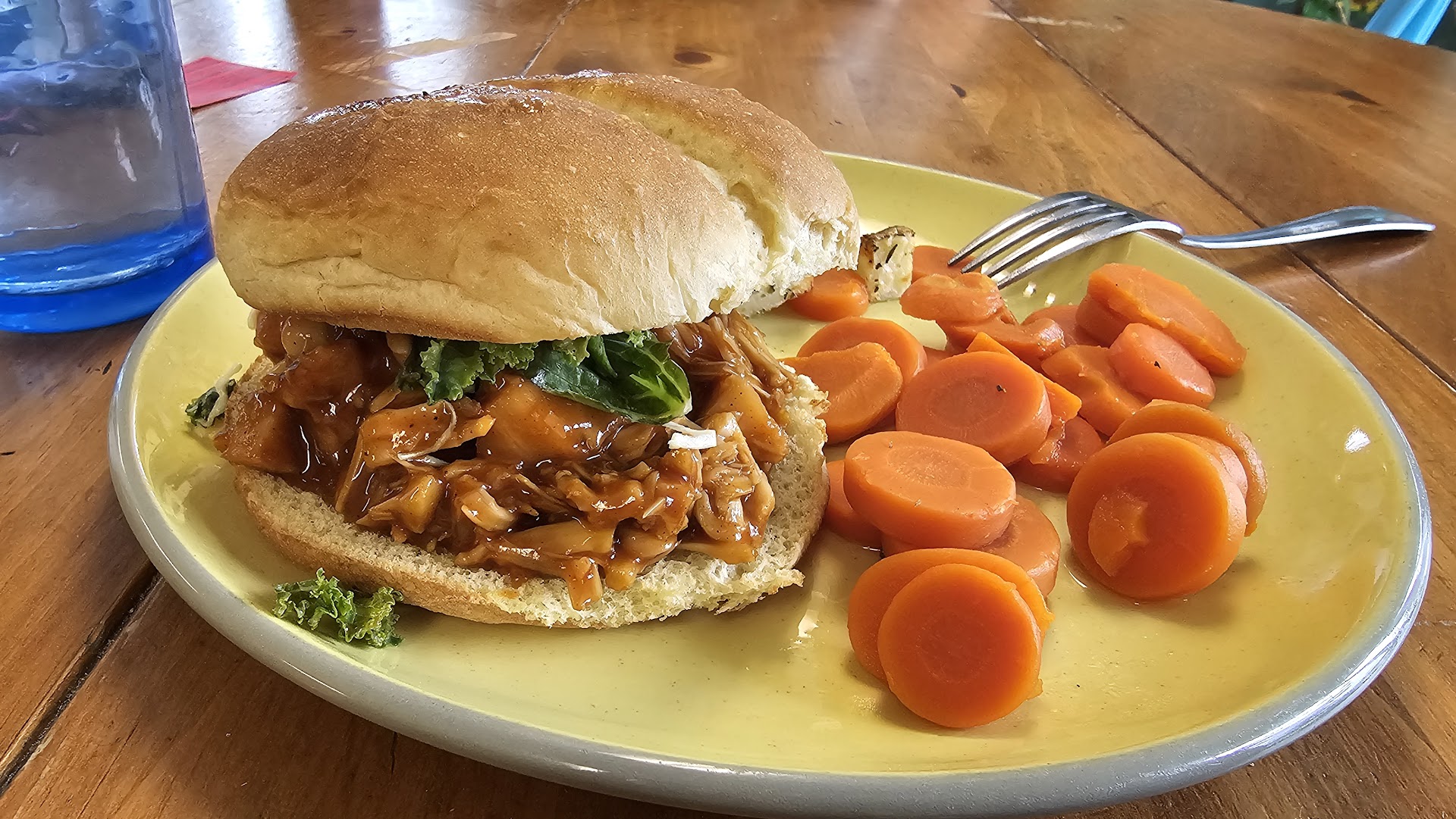 For added fun, I has a patron pick out my meal, which was the jackfruit Bar B Que sandwhich with a sideof carrots and seasoned potatoes.