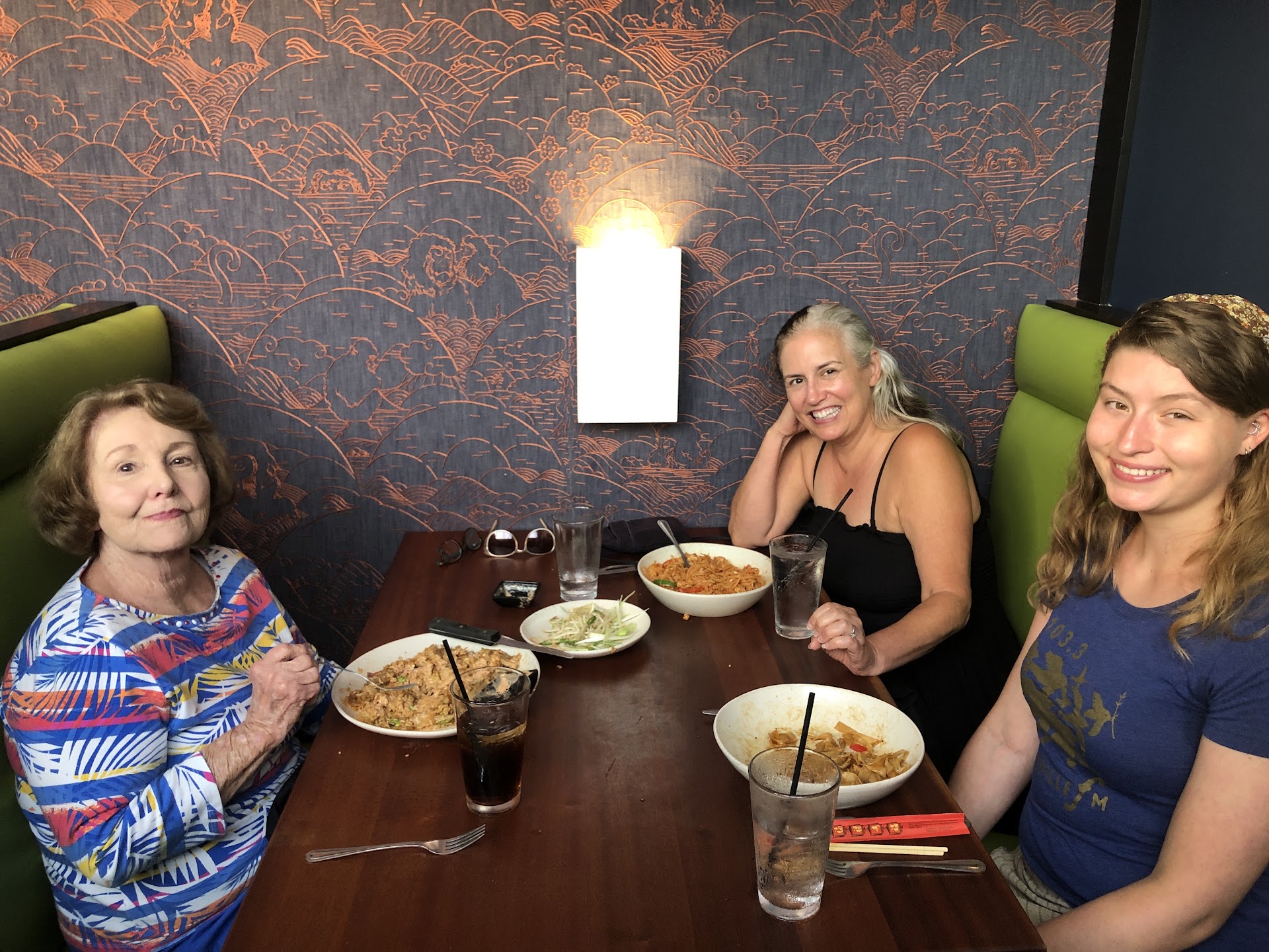 My daughter’s drunken noodles were the only disappointment. Yes, we had Thai aupairs when I was in grad school, both of them were excellent cooks, so perhaps we are a bit spoiled, but we also have eaten Thai food in restaurants all over the world, and drunken noodles usually have a wonderful flavor profile with a lot of umami and some lovely spice. This one was just a bit bland. I wonder if perhaps a regular drunken noodle spice level/flavor profile would be a bit odd for the area? I’m not sure. But they were a disappointment. The chef also had a really heavy hand when it came to onions and sprouts. See the photo of my mom picking them all off.