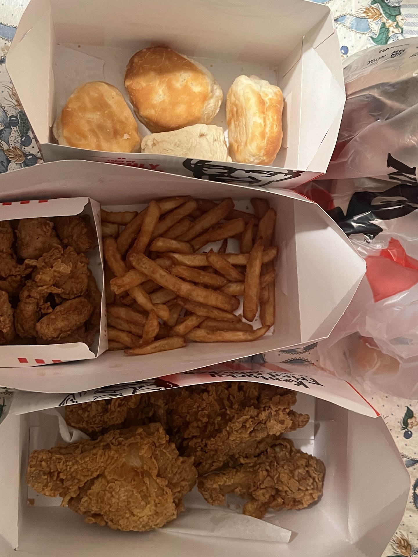 Read moreCame through at 8:30pm because my grandmother wanted 2 legs. I ordered her food then I asked for a chicken sandwich "we don't have sandwhiches." Okay, I get it, you're out of things sometimes. I'll do the 3pc tender "we don't have tenders." .... okay.... "what time do you guys close?" Maybe they close at 9, and I don't want to be that jerk. "We close at 10 but we don't have tenders right now" fine. Whatever. I ordered my grandmother's then I just got a breast and wing meal. She didn't say a single word to me at the window. My grandmother's legs were old but so is she so she didn't bat an eye. My breast was not even edible it was to dry, it took force to even get the skin off of it, which I've never seen! No wrapper in my box either which isn't much but it's kind of gross to me. No receipt. (My fault. I should have made sure she handed it to me) very very upset and disappointed with this. It's a Friday night, and you don't close for an hour and a half. And it would be a 100% different story if it would've been "we don't have that up right now it'll take X time to cook" or even "and I'm sorry, but we're unable to make more tonight" just very poor...