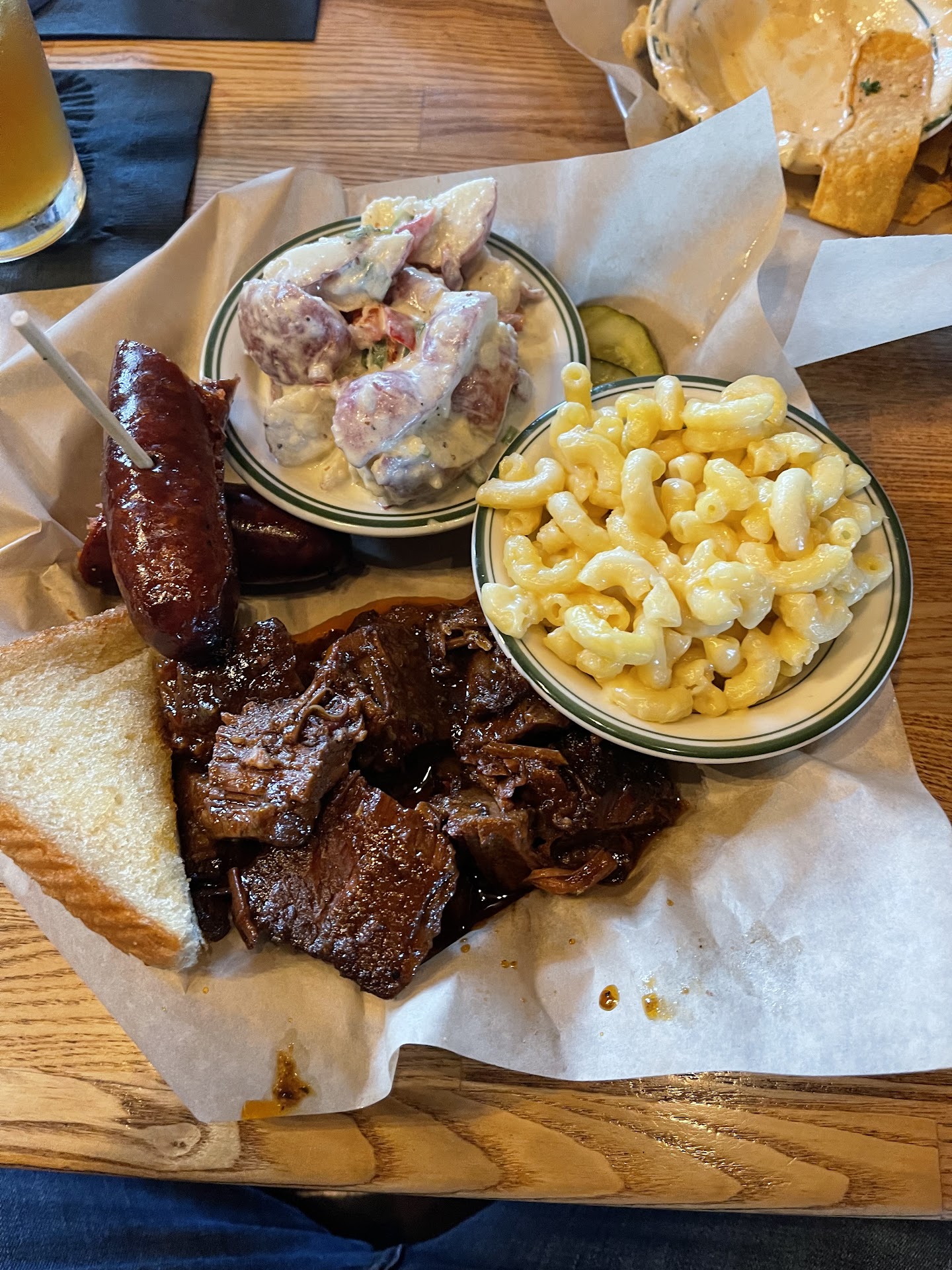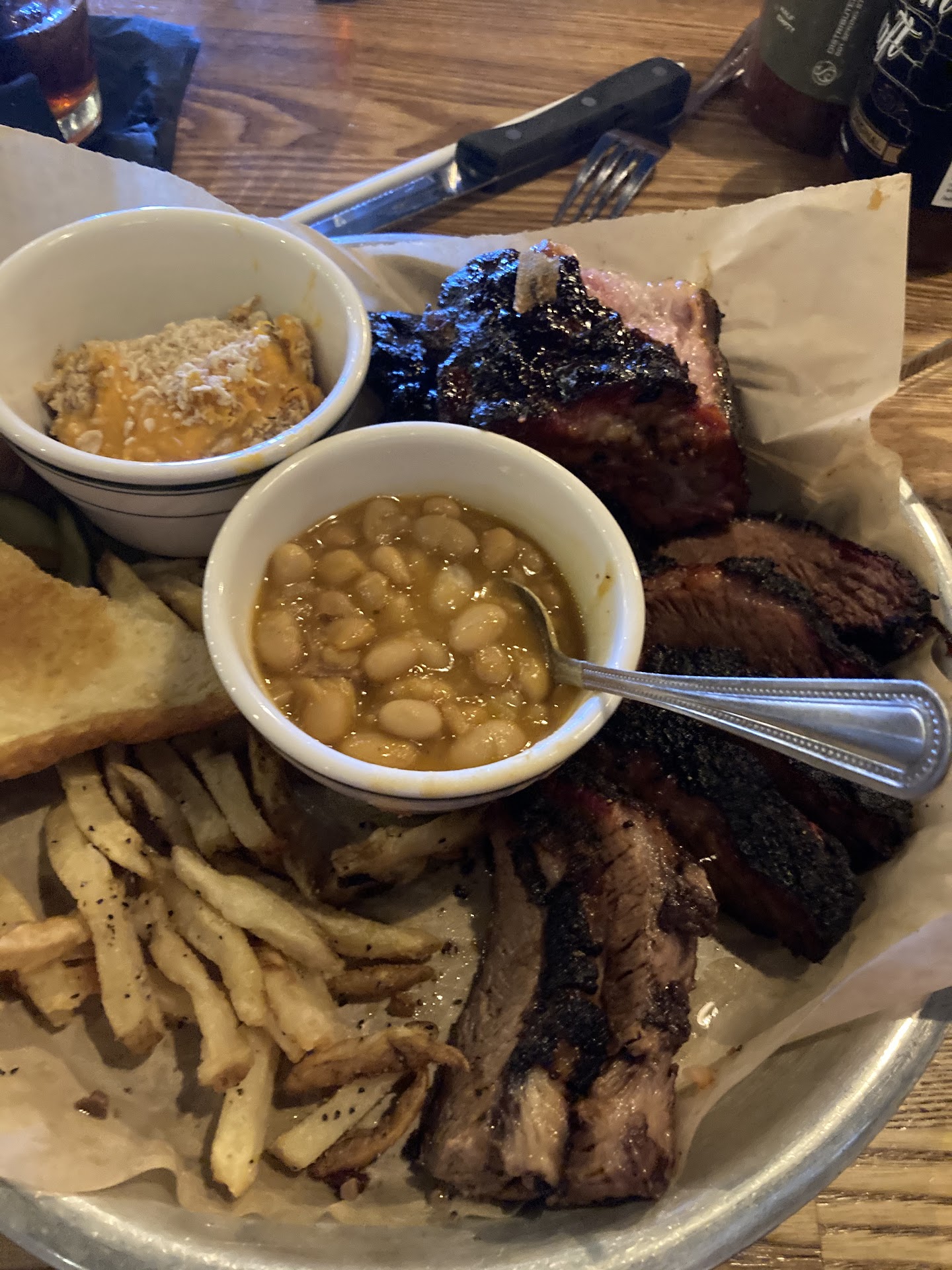 Let me start by saying our waiter was wonderful. The atmosphere was ok but then again it was early in the day. The food is where my review is here. The sides were absolutely delicious however, the meats... We ordered 2 of the Tennessee Trinity plates and in both we ordered ribs. Two things, it looks like on both platters we were given the end of the rack as the ribs were absolutely puny. About 2 inches in bone. They were also burned to a char and very very hard. I know baby back ribs are small but I also know if you get the middle of the rack they are more meaty and tender. It felt like the kitchen served us a leftover of the rack. The rest of the meats were ok, they weren't that tender and very dry. The pulled pork was also burnt and it looked like they served us the scraps left over on the grill plate. The pork belly we thought would be crispy but it wasn't and although fatty this was the one meat that was juicy. The sausage was not good, dry and small. The brisket was "ok". Overall for the food we probably won't be driving 2 hours again. Maybe we just happen to arrive when they were getting rid of left over meats? Not sure but we didn't complain. We are a family who migrated to the USA in the 60's and had kids and we know what it's like to not have food so we would never send food back. However, if this isn't the norm of the food then we just got unlucky. We did meet some beautiful people on the table next to us and became friends and we keep in touch. I just wish the meats were all the hype I had read and seen on the pictures and reviews. But it the meats fell very...